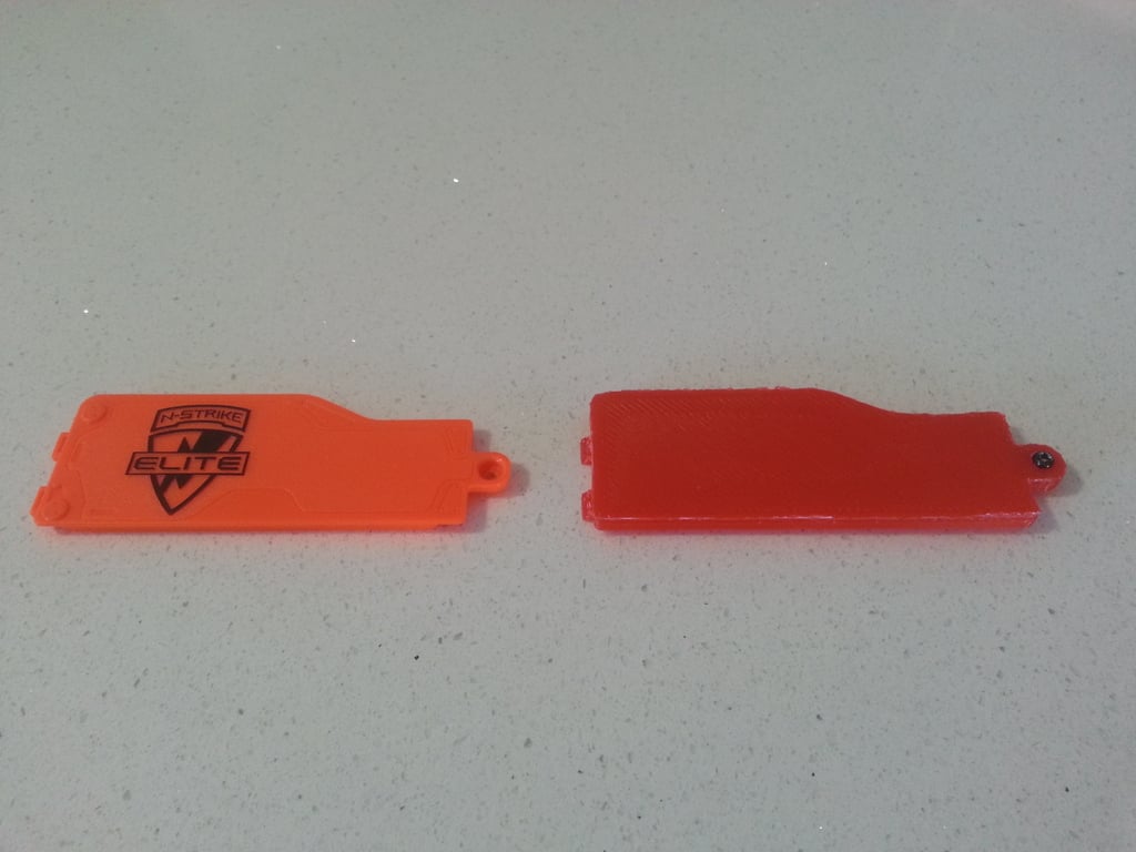 Dette er en erstatning for batterikompartmentsdækningspanelet til Nerf Stryfe. Det giver den ekstra plads, der kræves for at installere et 9V batteri i det eksisterende batterikompartment.