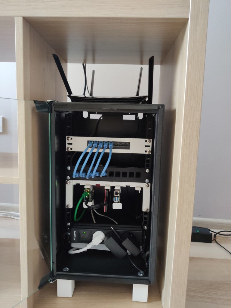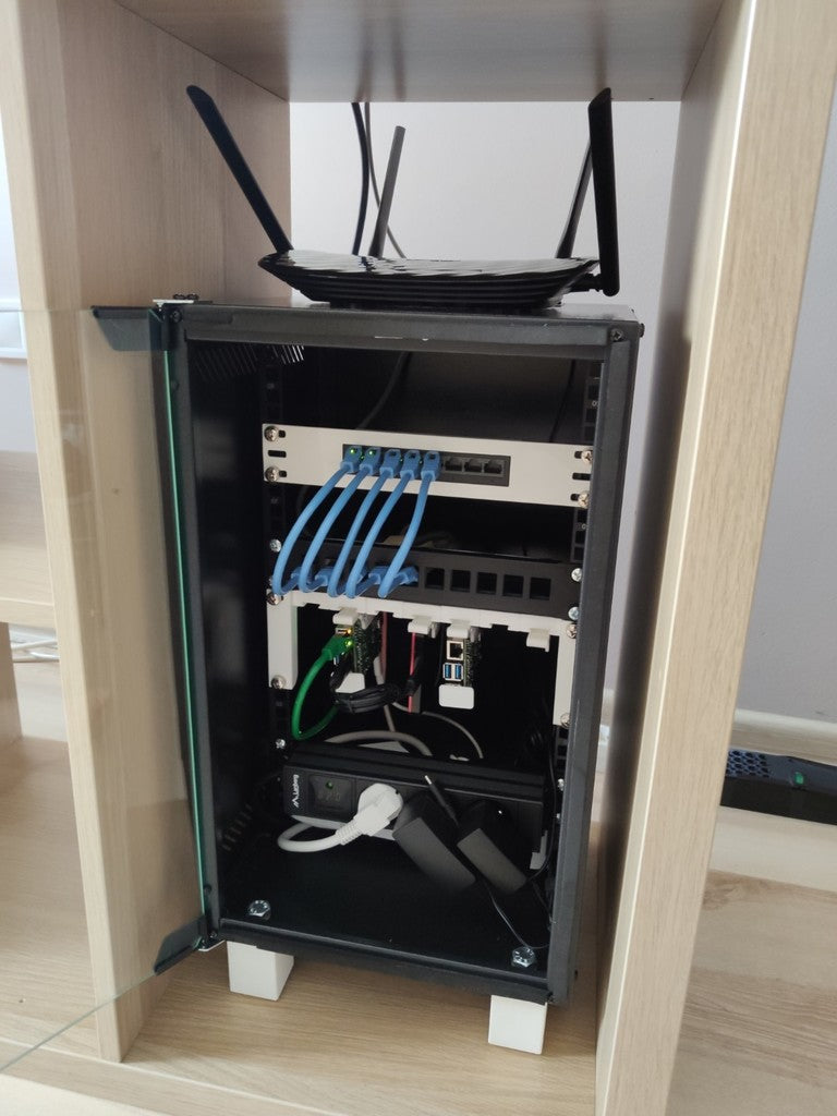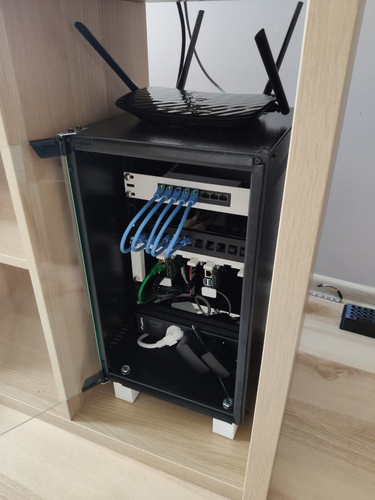 En hjemmeserver-rack designet til brug med en 10" indkapsling. Lavet med specielle løftben for at kunne passe ind i en IKEA Kallax hylde. Perfekt til organisering af dine server enheder eller Raspberry Pi opsætninger.