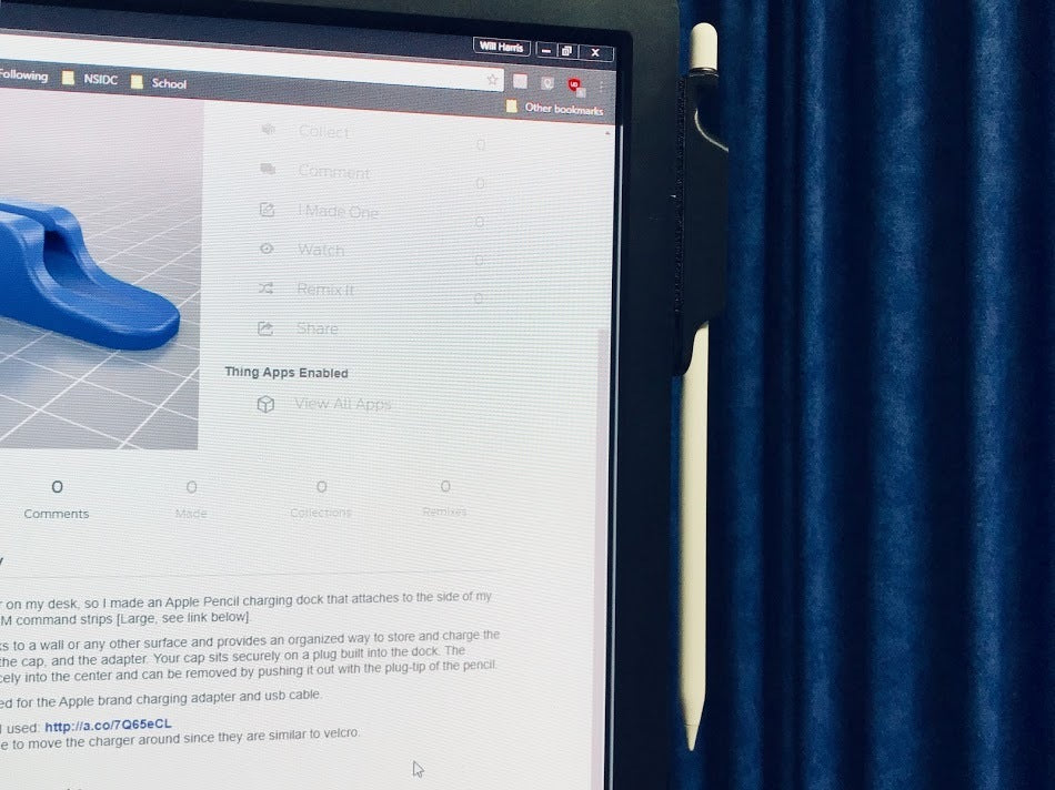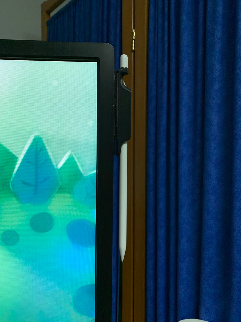 Dette er en opladningsdok til Apple Pencil, der kan monteres på siden af dit computermonitor ved hjælp af 3M command strips. Doksen holder og organiserer din Apple Pencil, dens kapsel og adapter sikkert. Den er designet til at fungere med Apples brand-opladningsadapter og USB-kabel. Med 3M strips kan dock opladeren nemt flyttes rundt, da de fungerer som velcro. For at sikre en tæt pasform er pladsen til kabel og blyant strammet lidt.