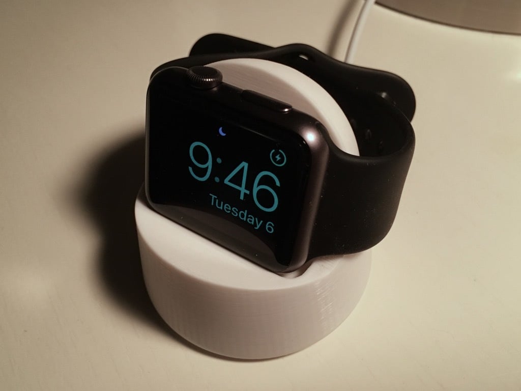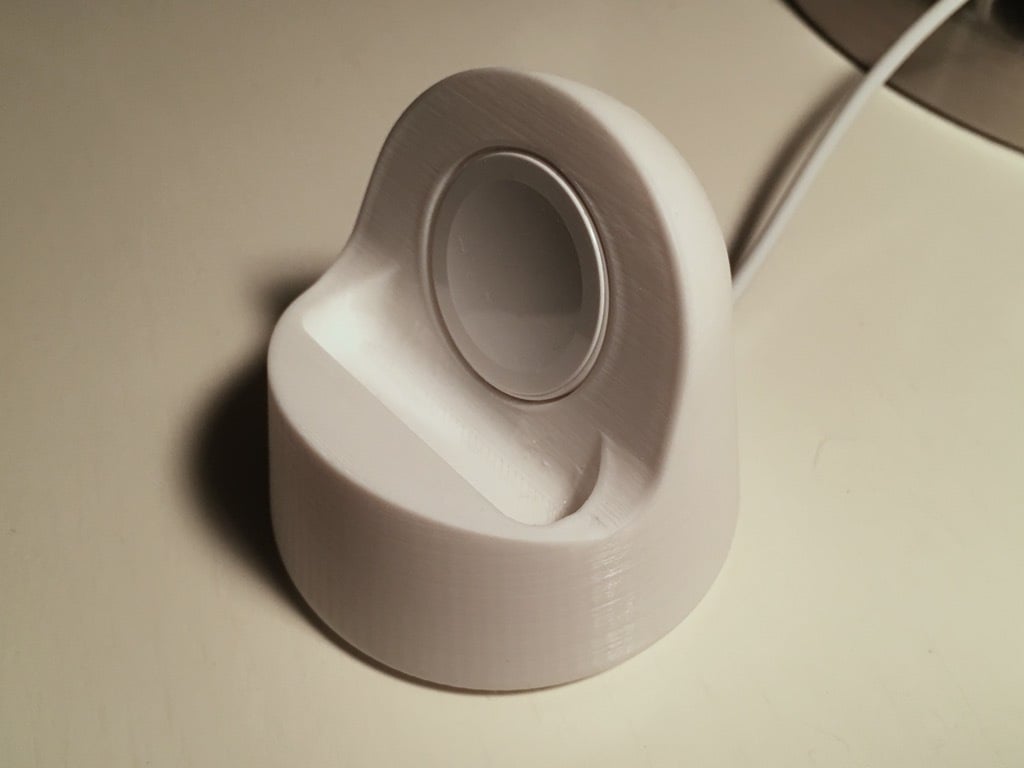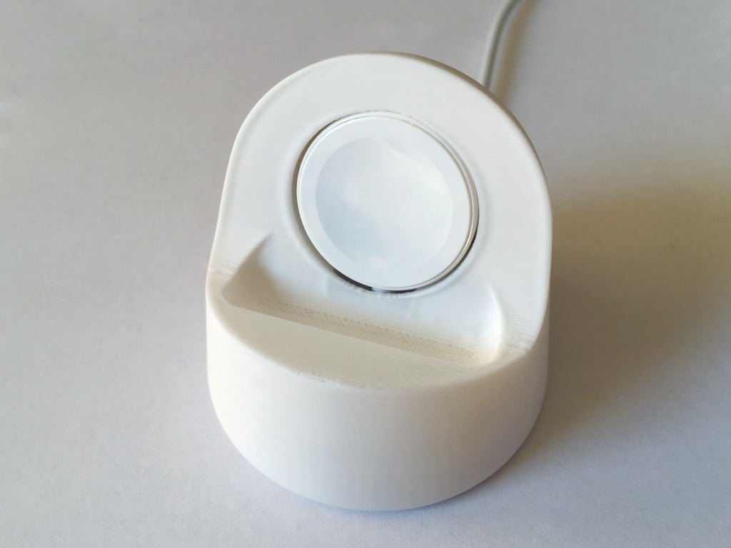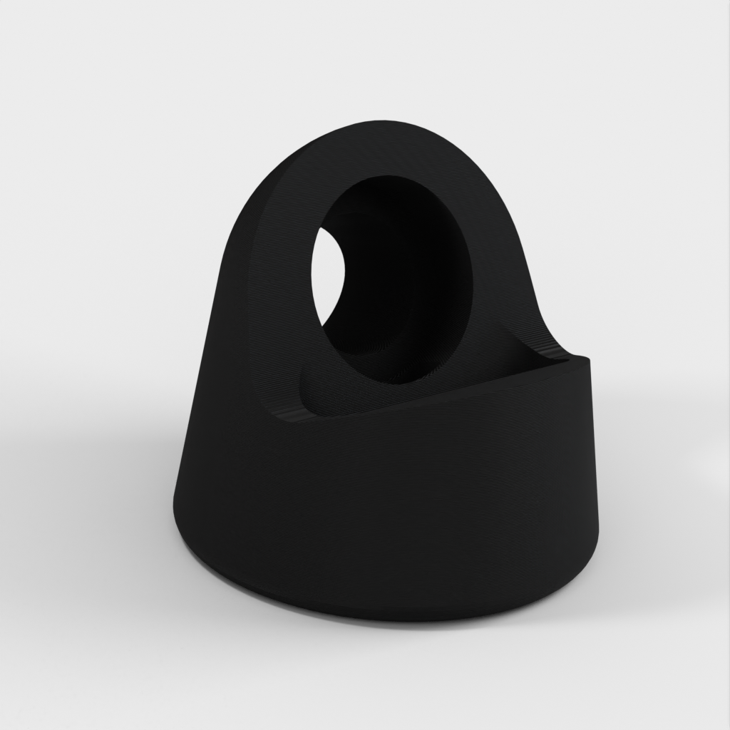 Dette er en dock til opladning af dit Apple Watch. Den er konstrueret således, at hovedkurven er lidt off tangent, og opladercylinderen er 0,5 mm større for at tillade en løsere pasform. Docken har kun en enkelt kabelkanal, der er U-formet i stedet for tre fjerdedele rund. Derudover er der et 5mm hul i bagsiden, så du nemt kan fjerne opladeren. Der er også tilføjet en version med en dybere kabelkanal og et 20mm baghul baseret på feedback. "Big USB"-versionen passer til Apple Watch version 6-kabler.