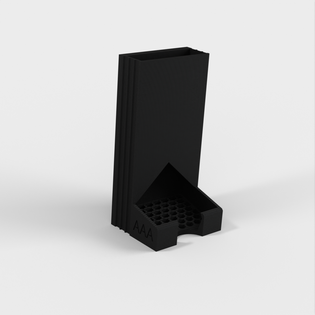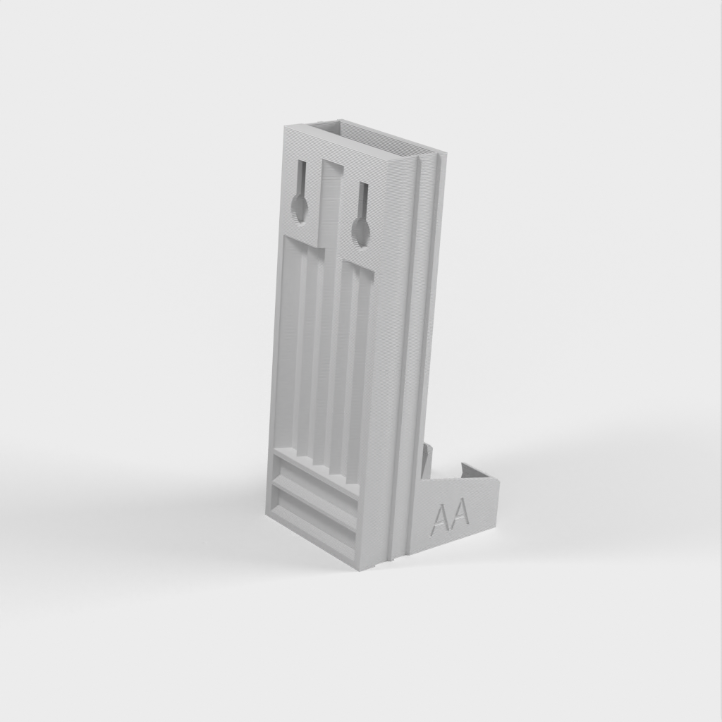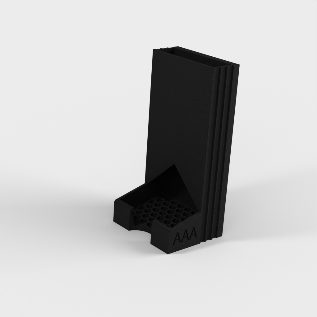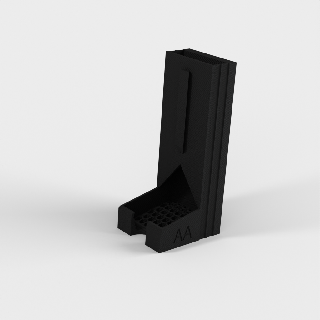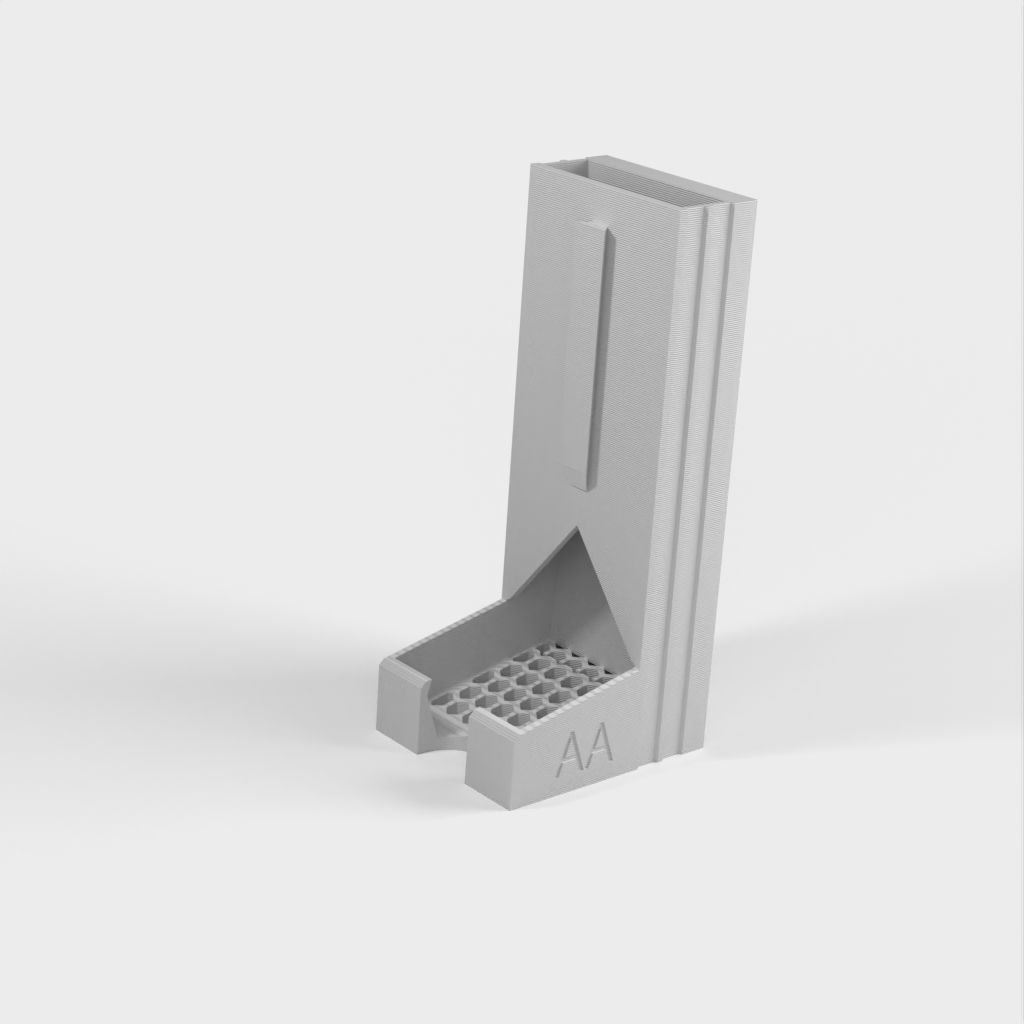 Batteriholder til AA og AAA batterier. Holdere kan sammensættes, og der er en vægmontering til rådighed. Det er et praktisk og rummeligt system til opbevaring af dine batterier og holder dit område organiseret og ryddeligt.