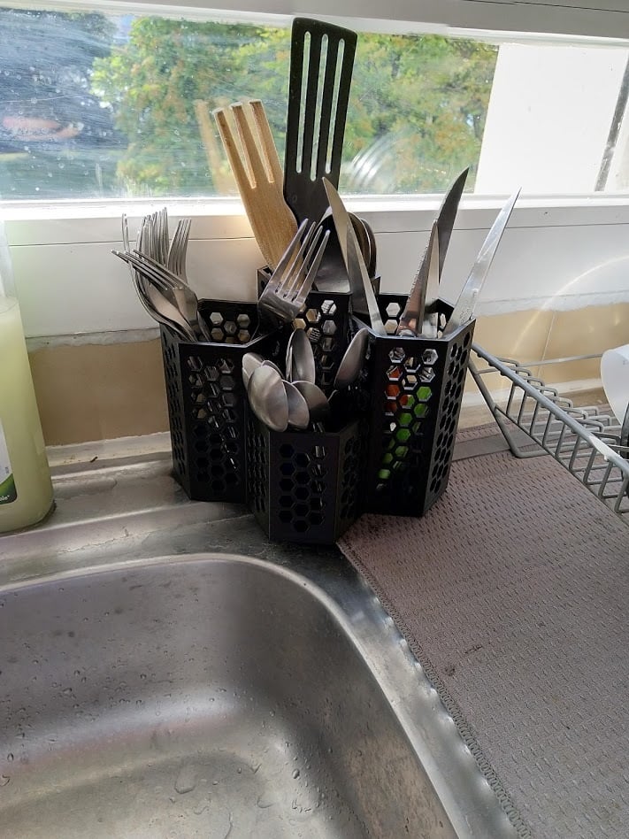 En praktisk bestikdrainer opdelt i fire bokse: en til små skeer, en til gafler, en til knive og en større boks til større skeer og andre køkkenredskaber. Små huller i bunden hjælper vandet med at dræne.