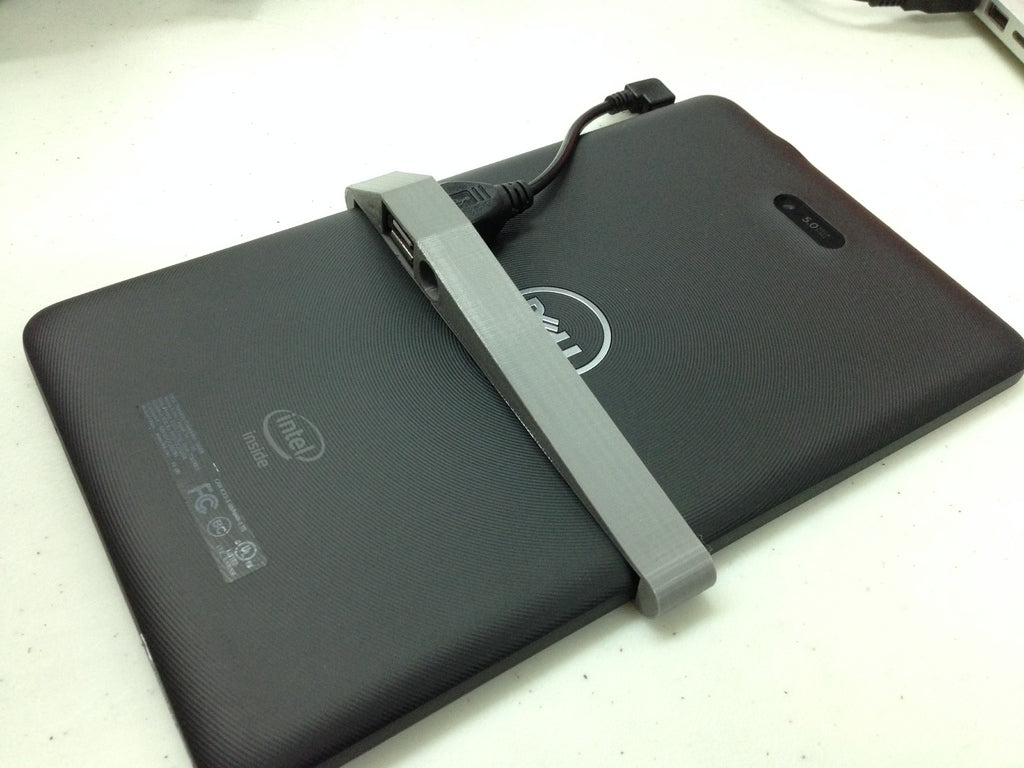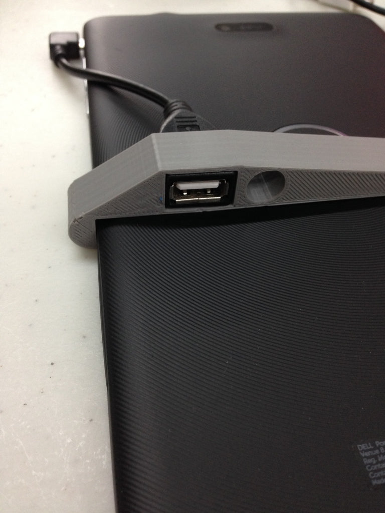 Denne specialdesignede holder passer til en "Dell Venue 8 Pro" tablet. Den tillader dig sikkert at montere en USB OTG-kabel på enhedens krop for at undgå belastning på den lille mini-USB port. Ved at forebygge skader på porten, som også anvendes til opladning, forlænger den holderens levetid.