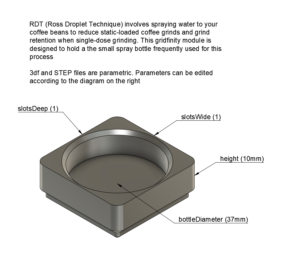 - RDT Sprayflaskeholder: En 1x1 blok designet til en 33,5 mm sprayflaske, ideel til at holde din RDT-flaske stabil og inden for rækkevidde.