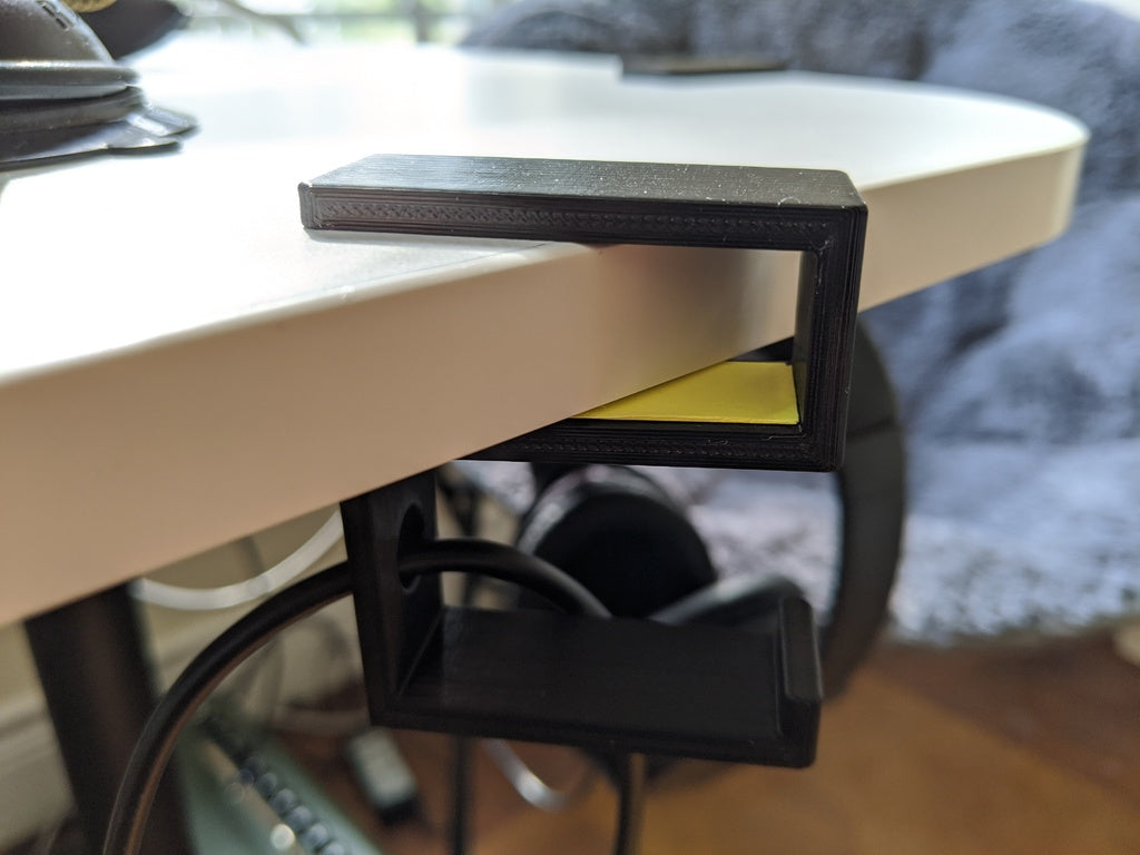 Dette er en remixet version af en krok designet til IKEA BEKANT skrivebordet. Den originale krog var for lille, så denne version har en bredere topkrog. Den passer perfekt ved hjælp af et par post-it-noter til at stramme den op.