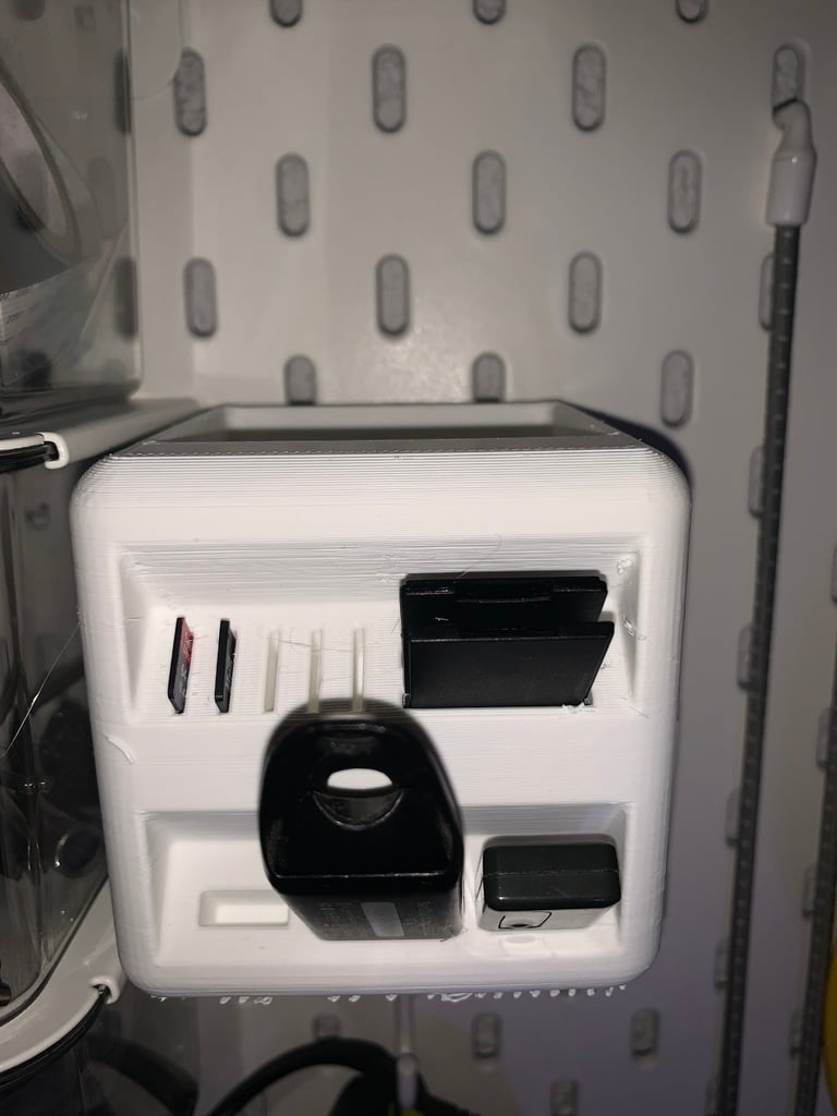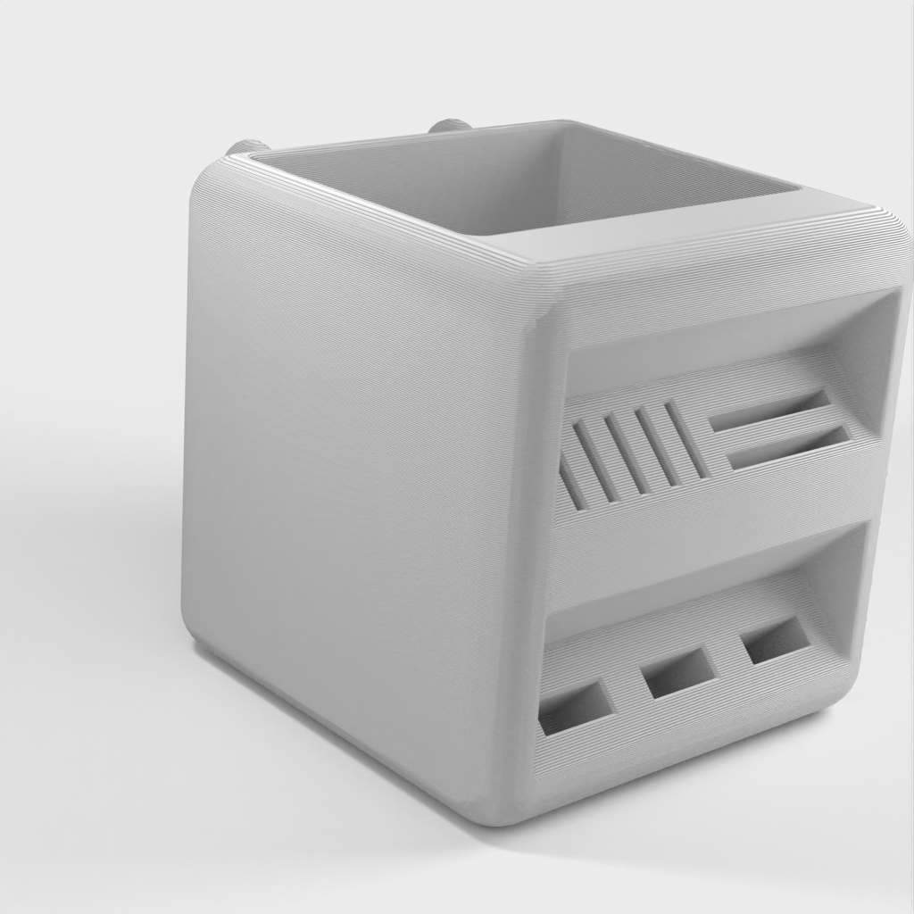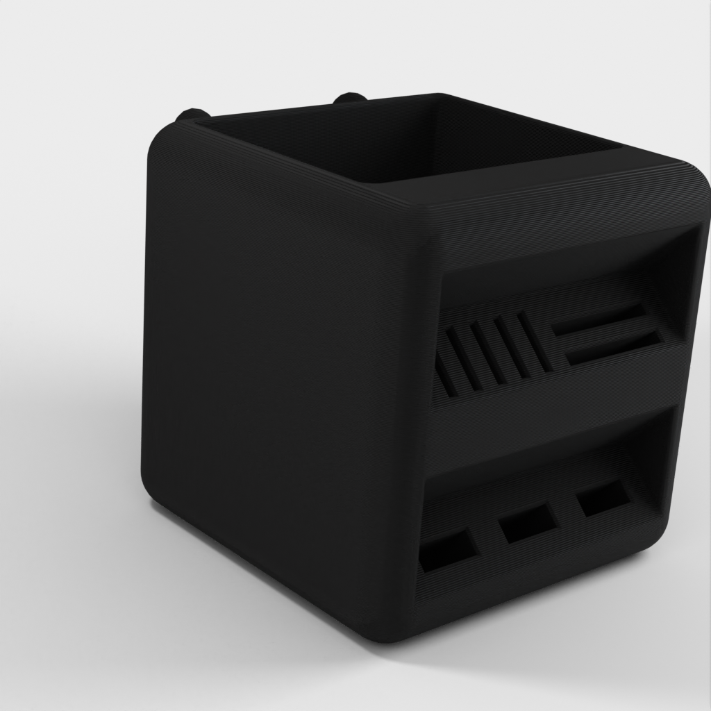 Penholder, der er designet til at passe på Ikea Skadis tavler. Dette holder tilbyder en praktisk og rummelig løsning til at organisere dine penne og SD-kort. Ved at give en pæn og organiseret opbevaring løsning, hjælper denne holder med at holde dit skrivebord ryddeligt.