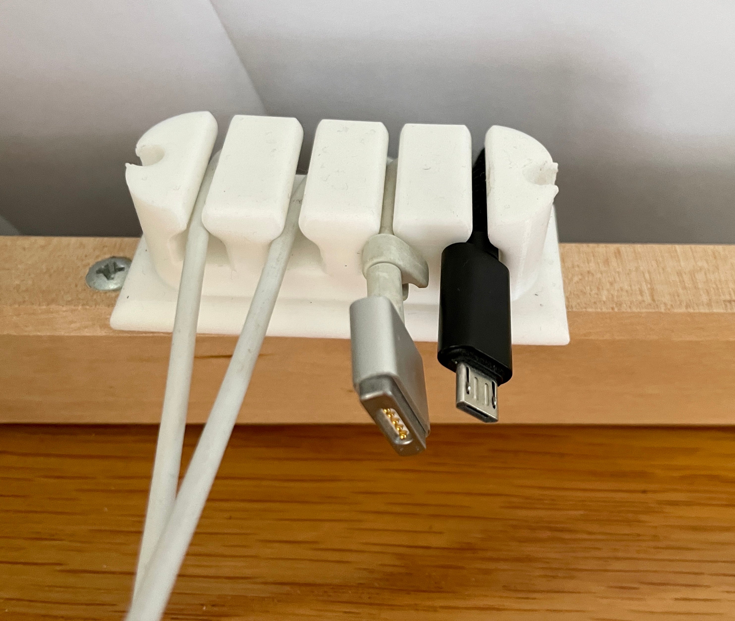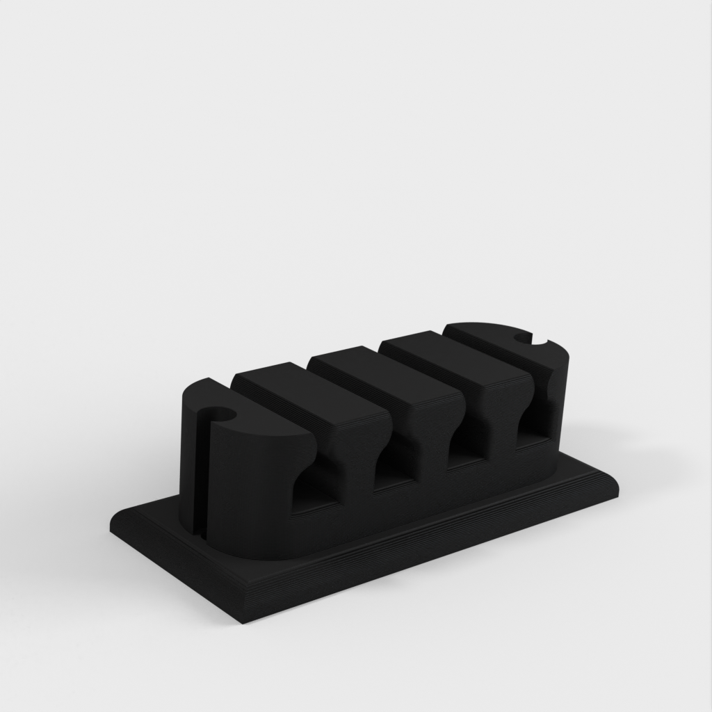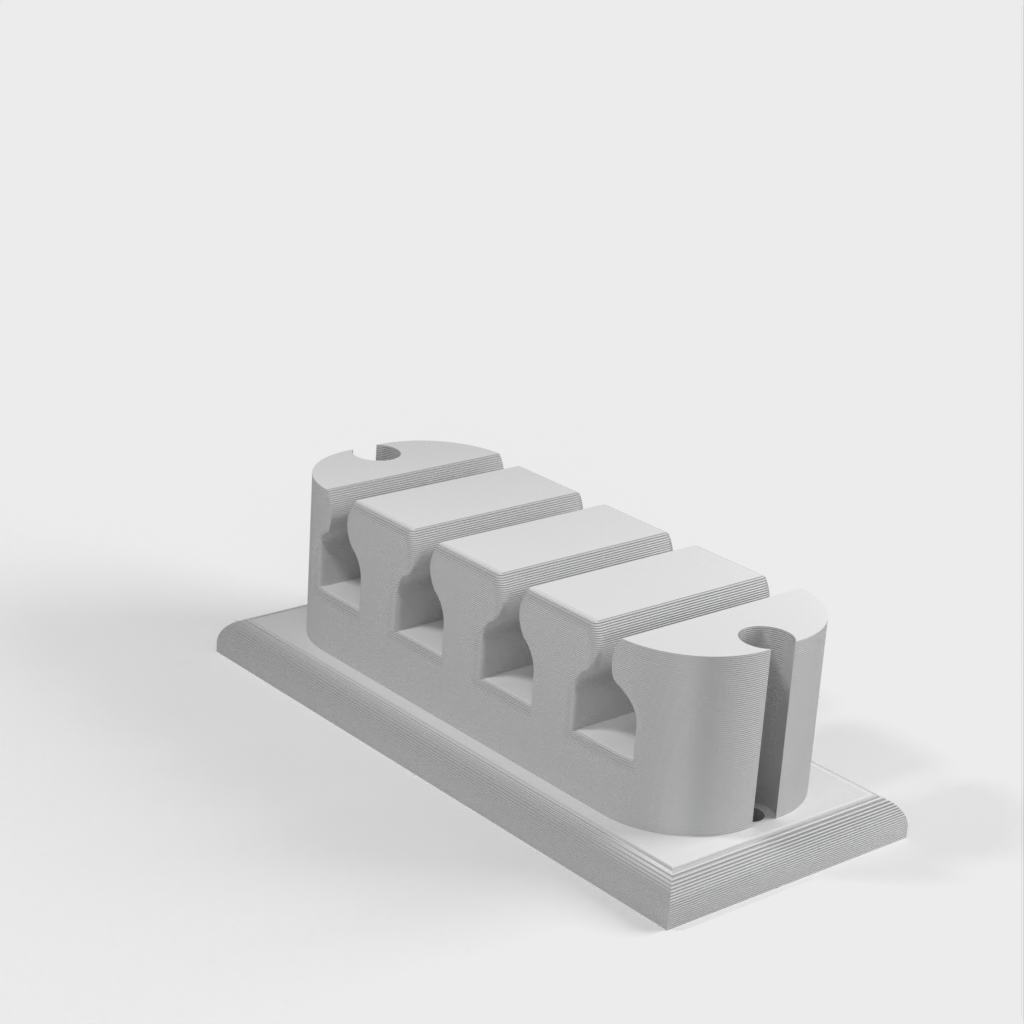 En 4-strengs kabelholder med skruehuller. Denne kabelholder er nem at montere og hjælper med let at ordne dine kabler. Det giver en simpel løsning på det almindelige problem med kabelrod. Du kan let og sikkert fastgøre dine kabler på plads og samtidig være i stand til at bytte dem ud, når det er nødvendigt. For ekstra styrke er der tilsat en 70 % infill og 4 perimeters i de områder, der oplever mest stress.