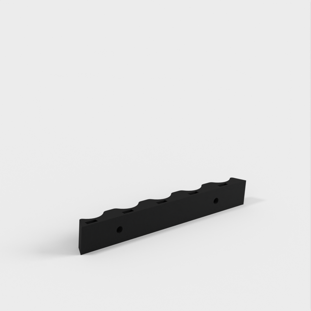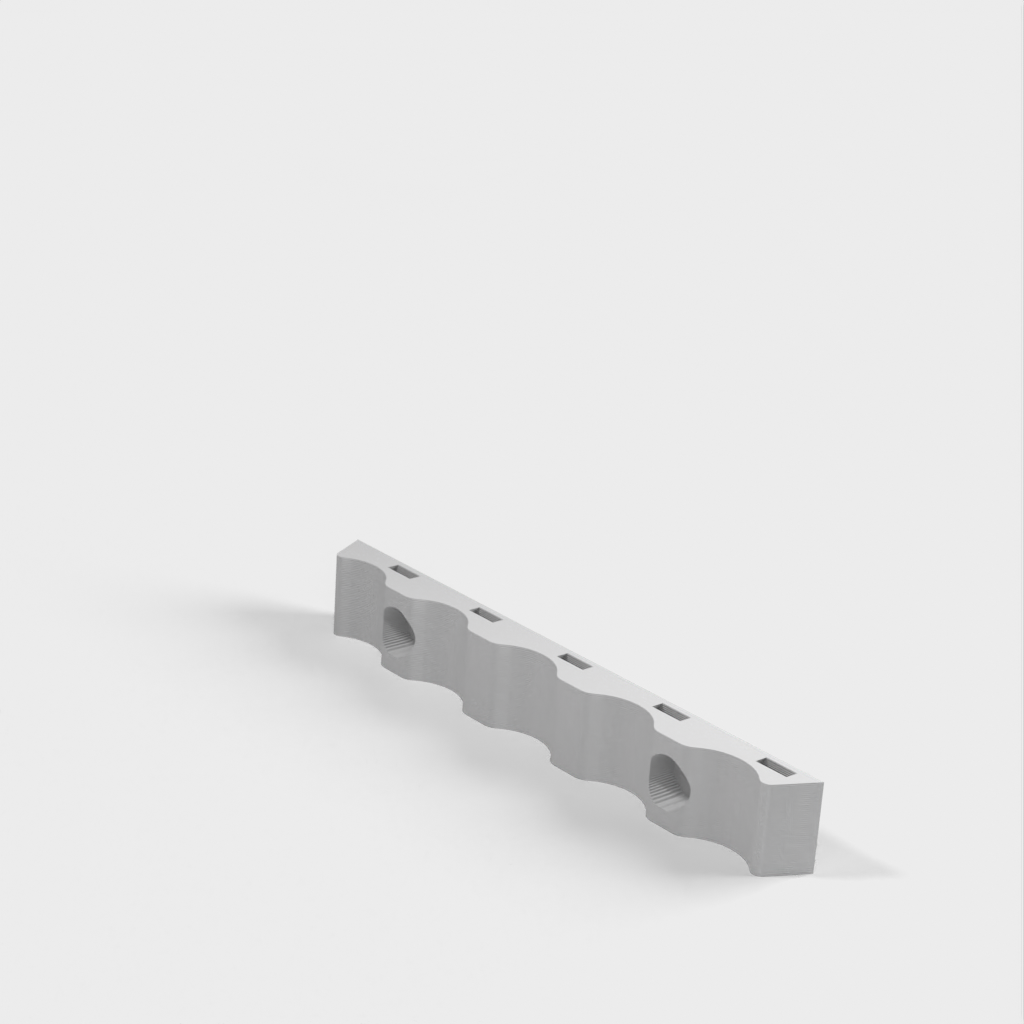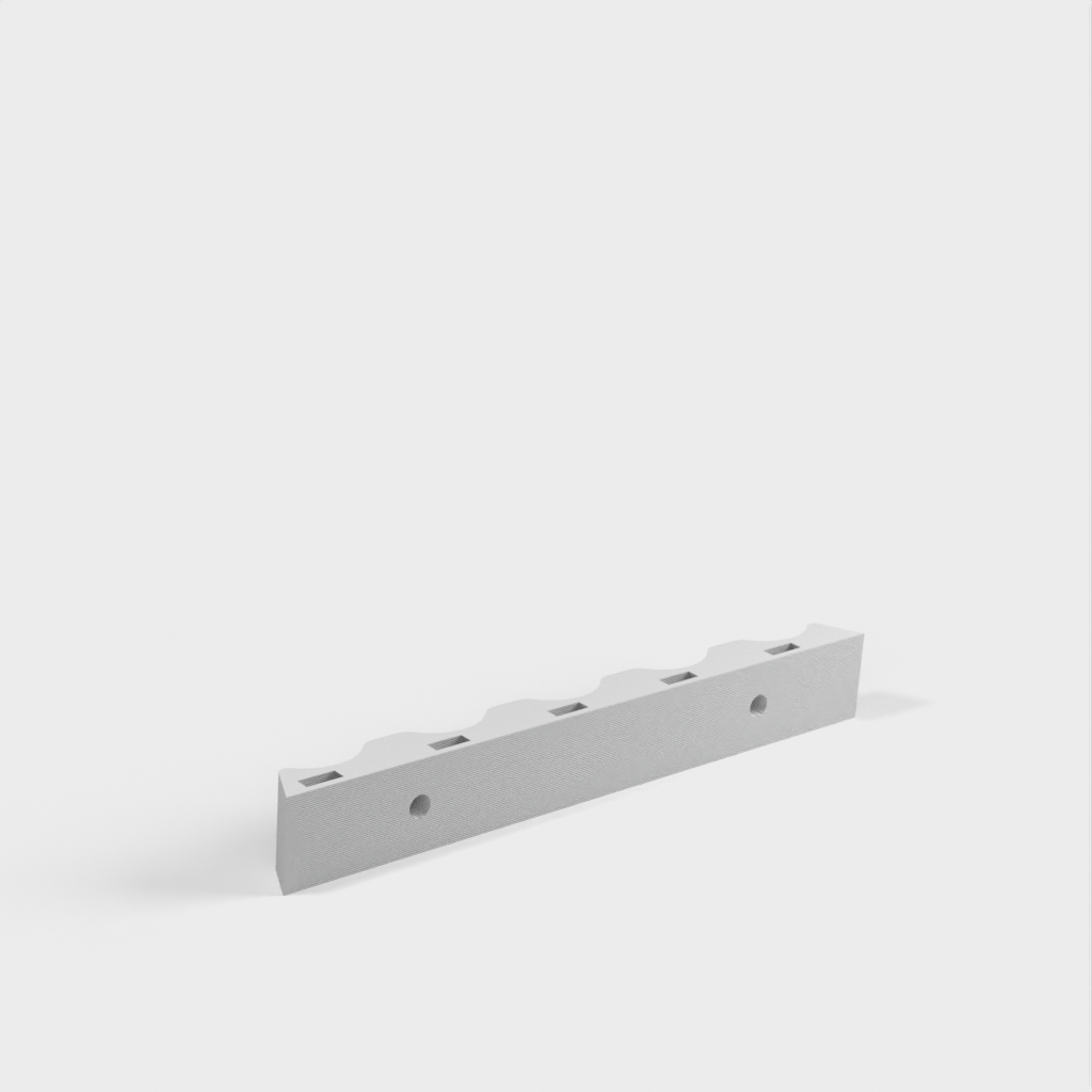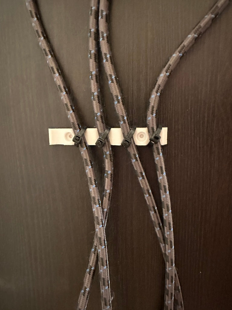 Denne kabelorganisator er designet til at holde 2, 3, eller 5 kabler på plads. Den kan fastgøres til enhver overflade med skruer eller klæbende strimler. For at organisere dine kabler i slots, skal du bruge kabelbånd, som vist på billedet.