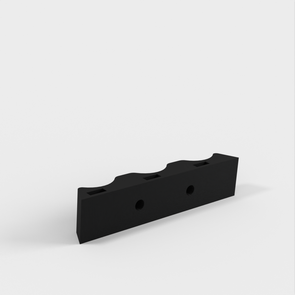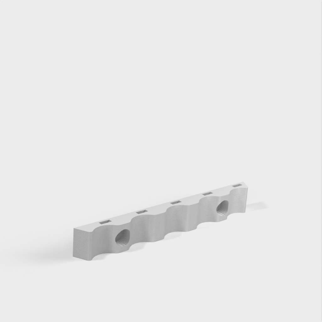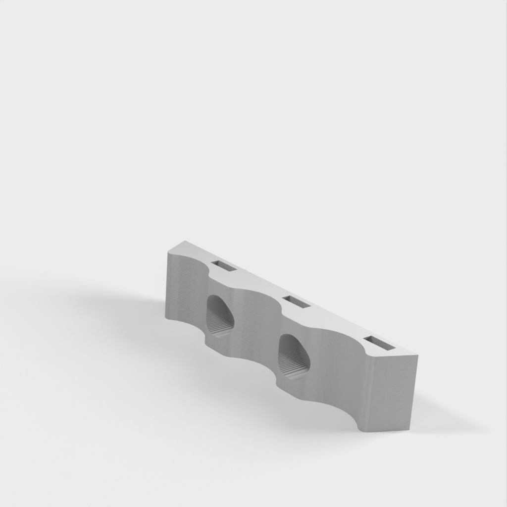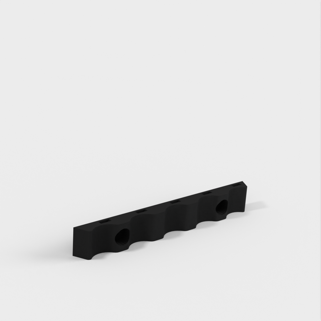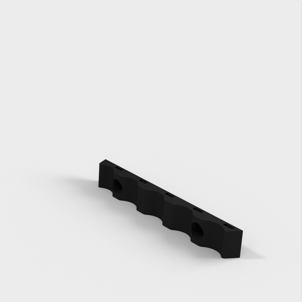 Denne kabelorganisator er designet til at holde 2, 3, eller 5 kabler på plads. Den kan fastgøres til enhver overflade med skruer eller klæbende strimler. For at organisere dine kabler i slots, skal du bruge kabelbånd, som vist på billedet.