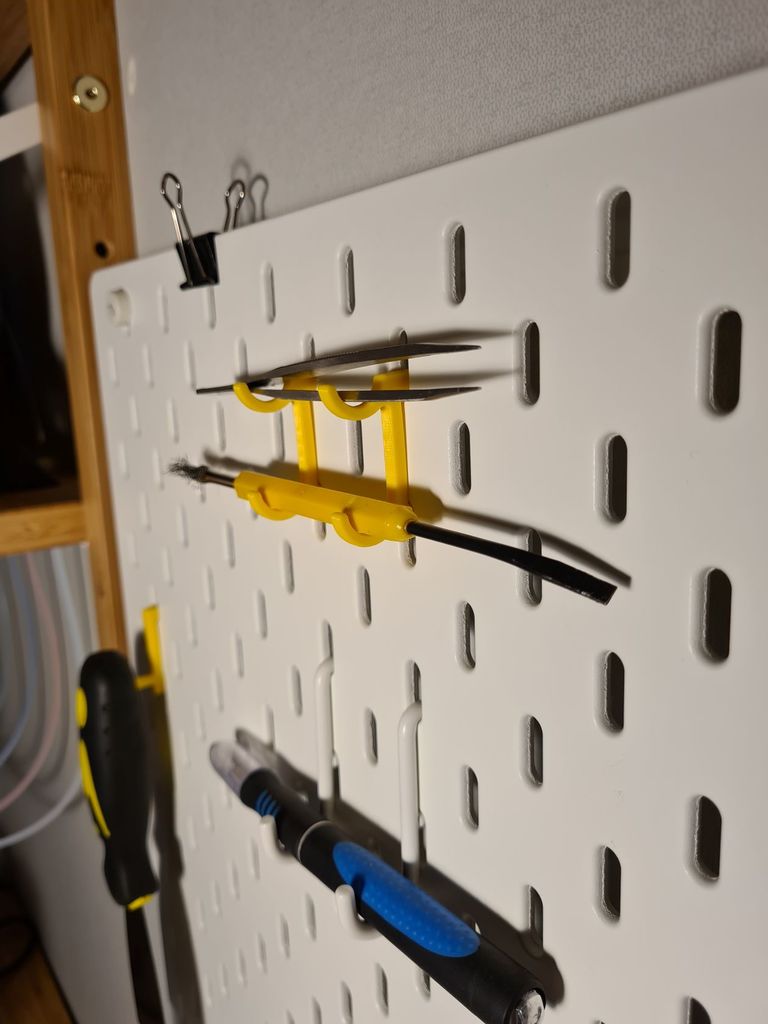 Simpel kroge- og dobbelt penneholder designet til IKEA Skådis hulplade. Produktet er meget robust og kan nemt monteres direkte på pladen, hvilket gør det nemt at holde styr på dine penne og andre små genstande direkte ved din arbejdsplads.