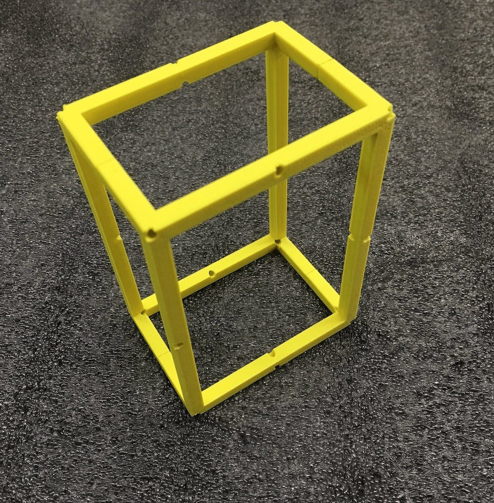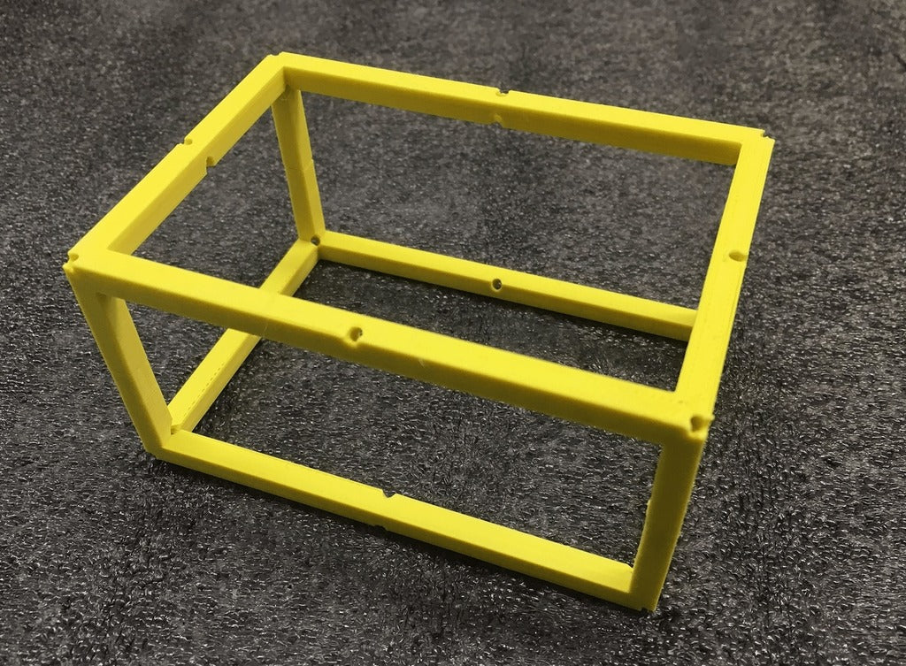 Dette kuboidramme består af to dele, hvilket gør printning lettere og hurtigere - du behøver ikke at lave nogen støtte. Det er et openscad-projekt, så du kan nemt tilpasse det til dine behov. Den inkluderede stl-fil har følgende dimensioner (højde, bredde, længde): 50x70x100mm
