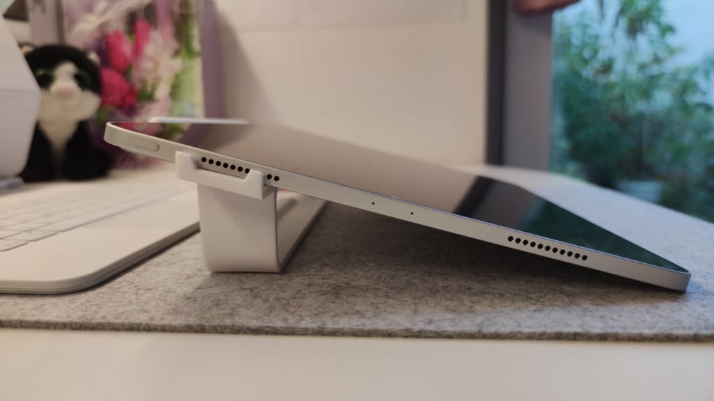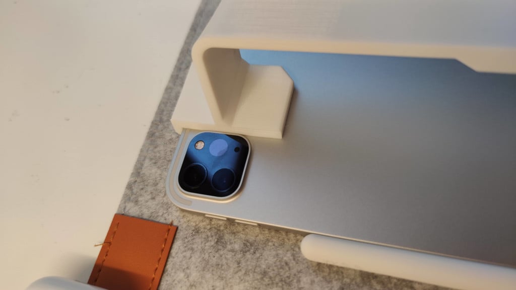 Stativet er udstyret med en præcis udskæring til højttalerne, hvilket sikrer, at lyden forbliver klar og uhindret under brug. En stivere og bredere bundbøjle bidrager til forbedret stabilitet, så din tablet ligger sikkert under selv intense kreative sessioner. De skrå kanter giver et glat og behageligt design.
