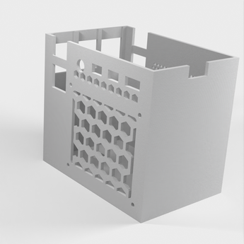 Dette er en minimalistisk kasse til Raspberry Pi 4, som passer til en Ice Tower-køler. Det øverste design af kassen har større hexagoner på bagsiden, hvilket gør det nemmere at printe. Efter print kan disse hexagoner fjernes for at give kassen et pænere udseende med den akrylplade, der følger med Ice Tower-køleren, monteret på siden af kassen. Klipsene og bunddelen af kassen er justeret for at passe bedre sammen og understøtte flere diametre af gummifødder.