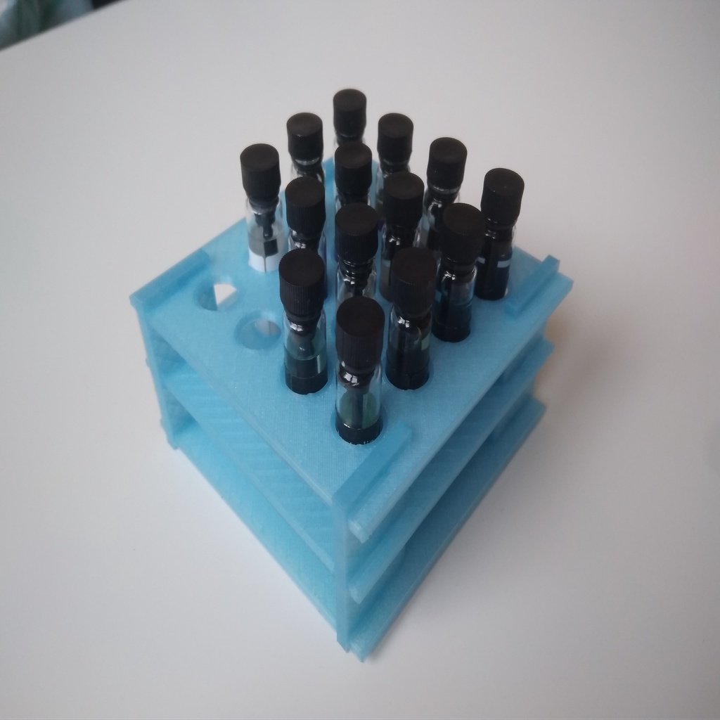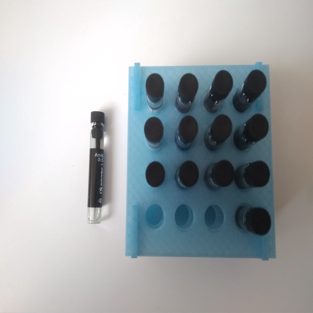 Prøveholdere til parfumeflasker kan rumme op til 16 prøver, og passer til prøver med en diameter på ca. 8 mm. Denne praktiske holder hjælper med at holde dine prøver organiseret, og kan nemt placeres på en hylde eller et bord.