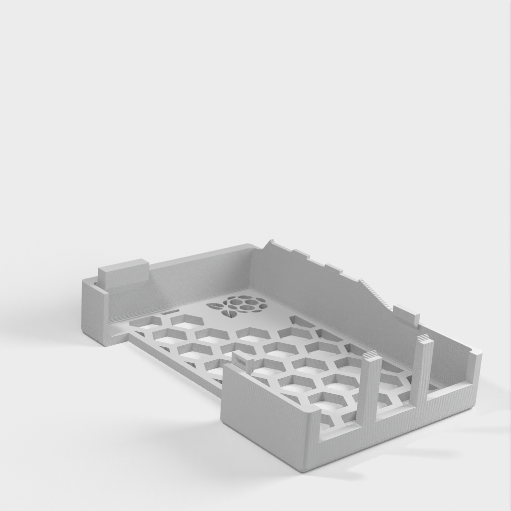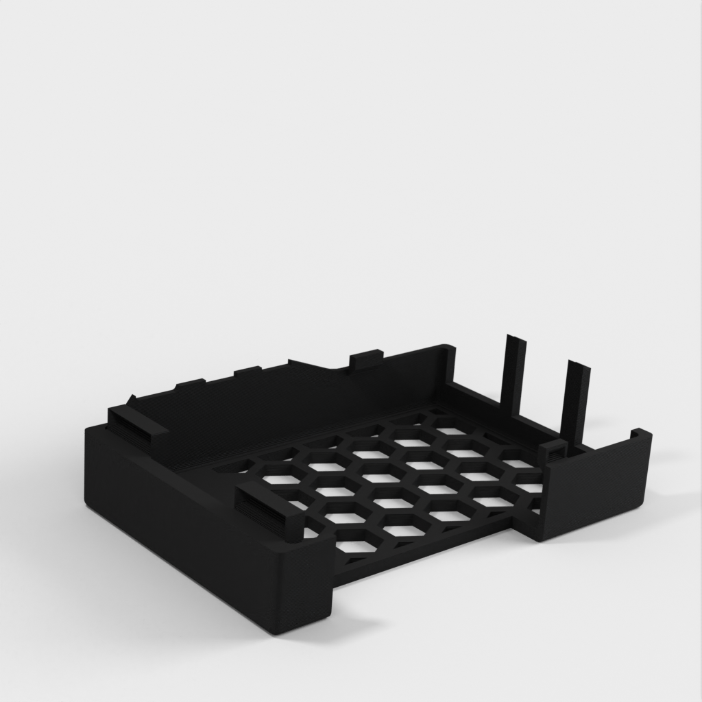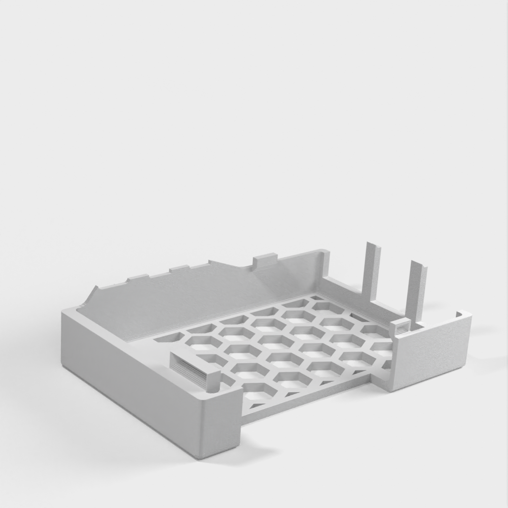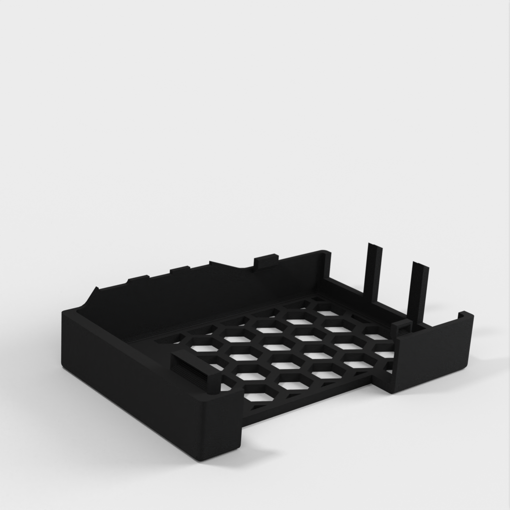 Et Raspberry Pi 5-etui med udsatte GPIO-pins og sekskantede huller for bedre køleegenskaber. Hvis du har en køleskive og officiel ventilator, der ligner den på billedet, er du bedre stillet med "Pins-Top-Hexed-With-Logo-HeatSink-Cutoff.stl".