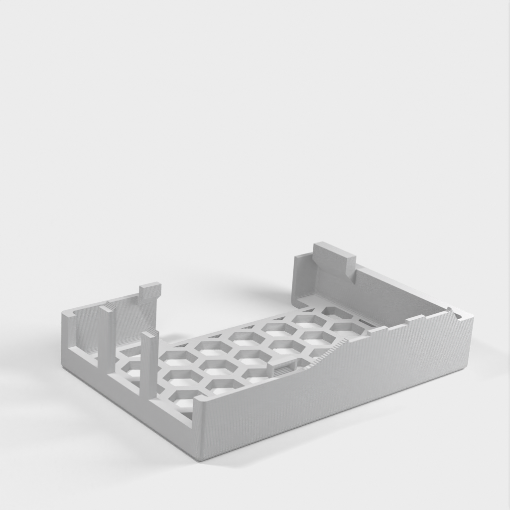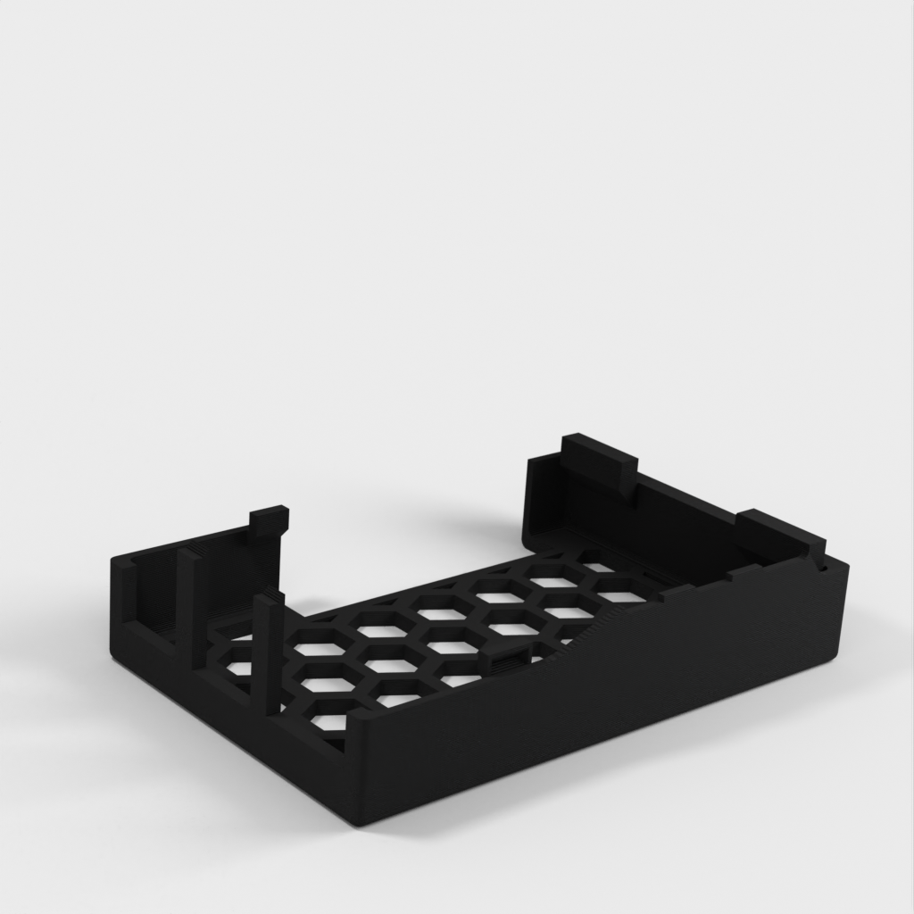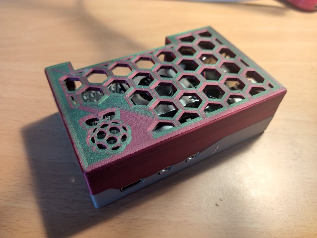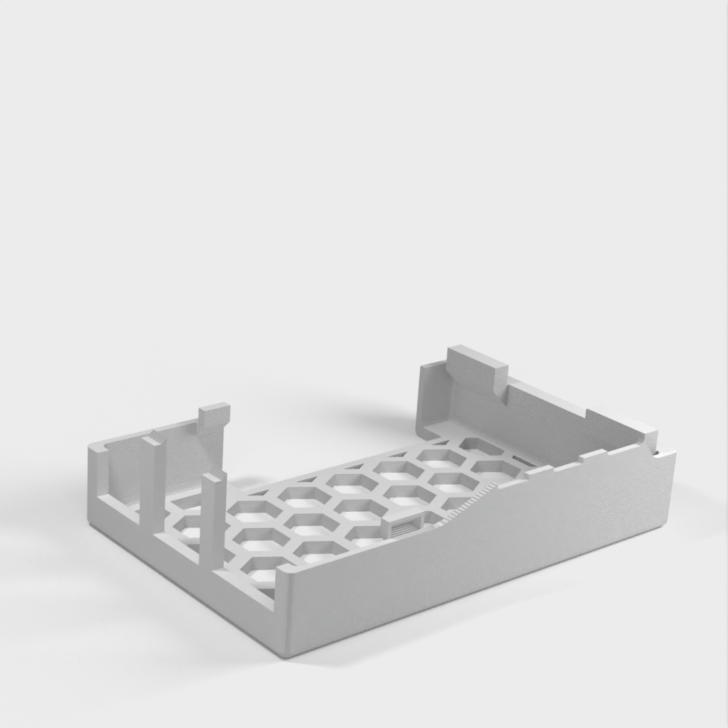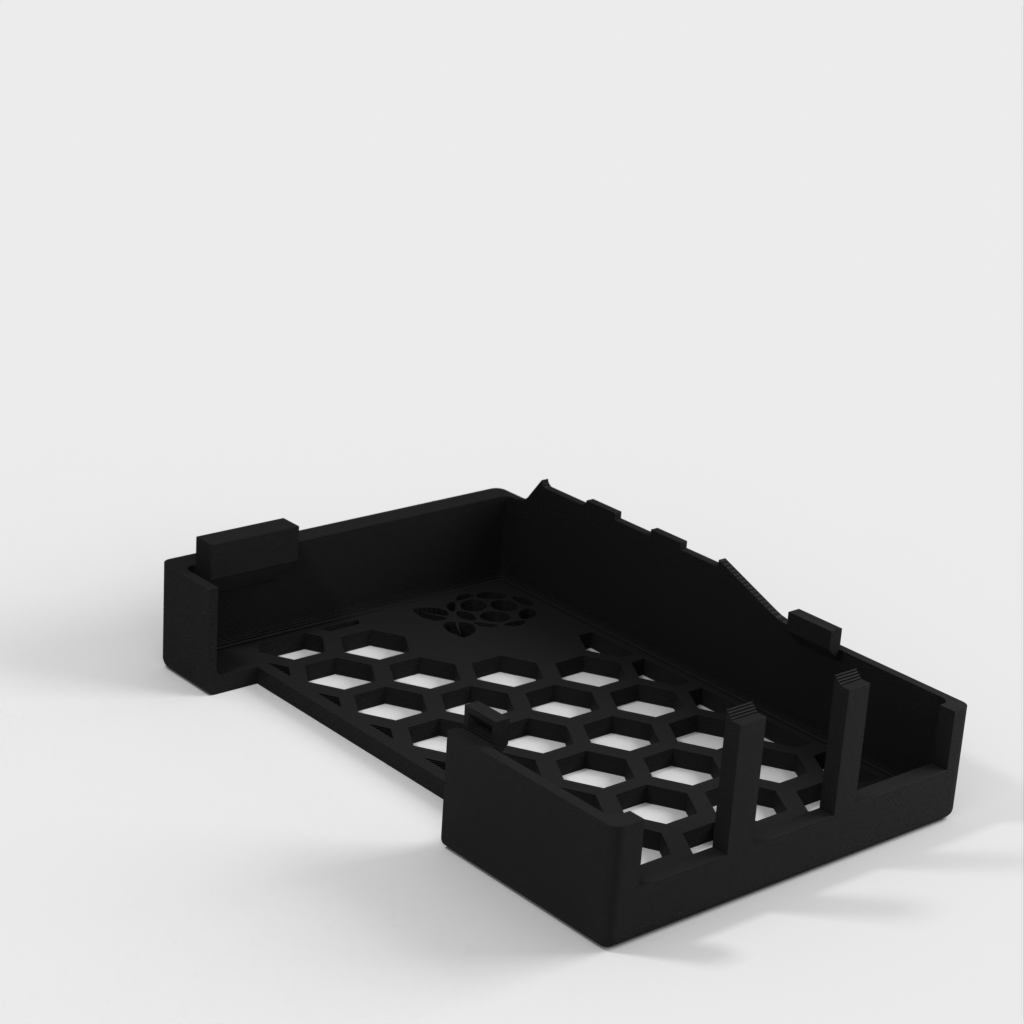 Et Raspberry Pi 5-etui med udsatte GPIO-pins og sekskantede huller for bedre køleegenskaber. Hvis du har en køleskive og officiel ventilator, der ligner den på billedet, er du bedre stillet med "Pins-Top-Hexed-With-Logo-HeatSink-Cutoff.stl".