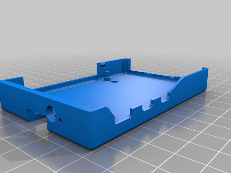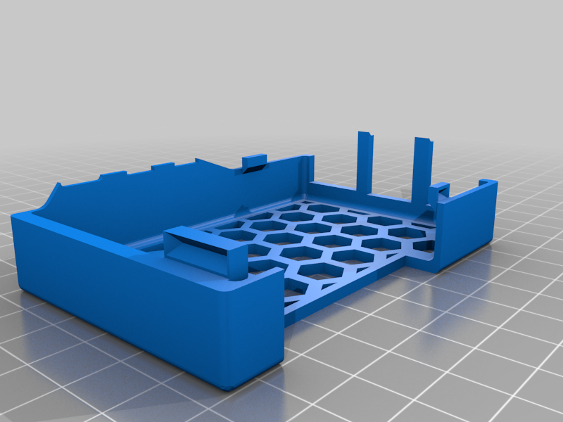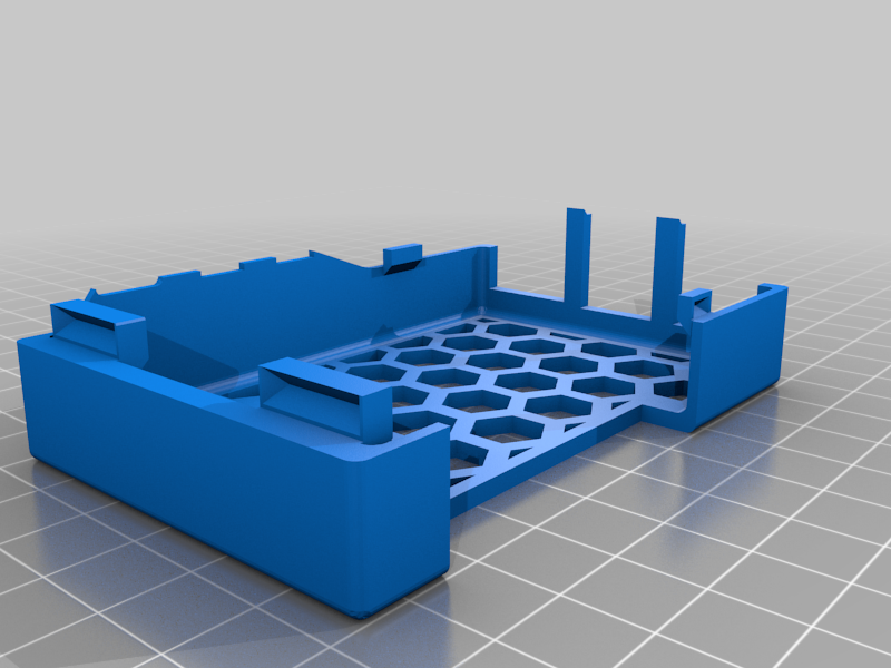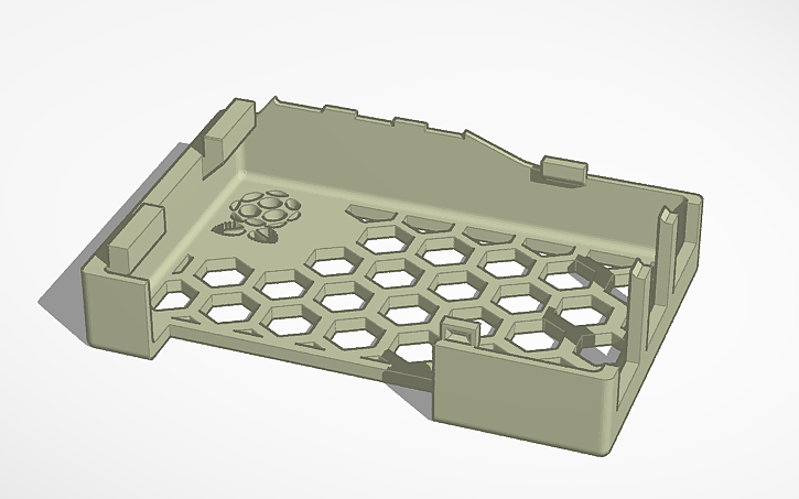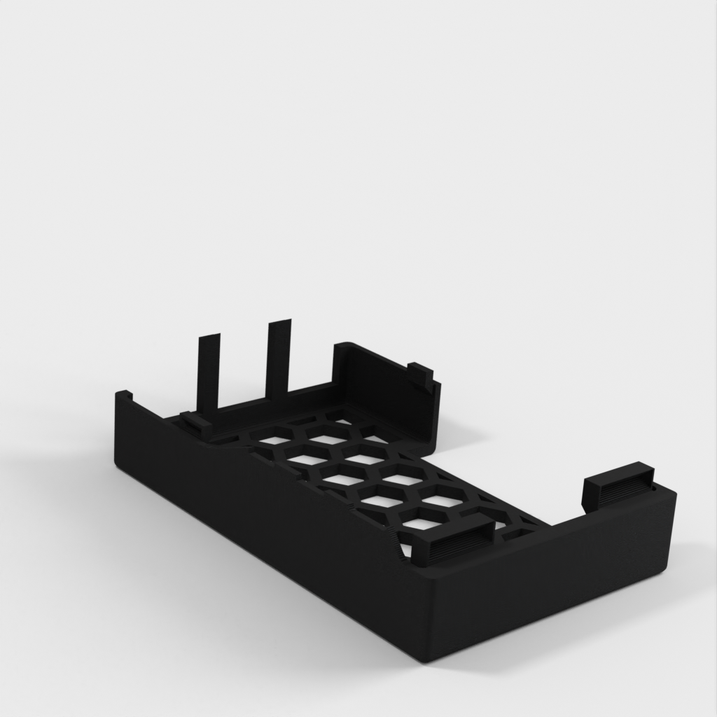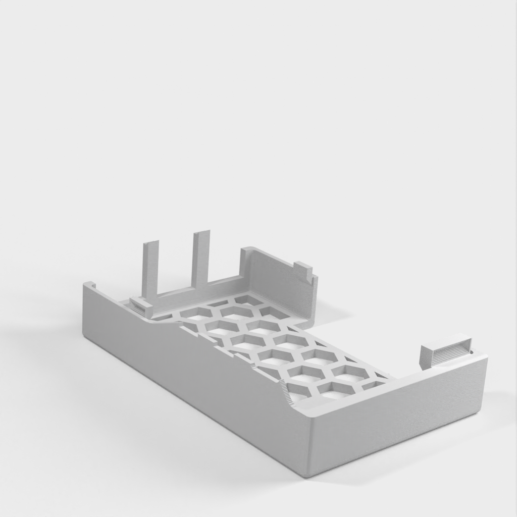 Et Raspberry Pi 5-etui med udsatte GPIO-pins og sekskantede huller for bedre køleegenskaber. Hvis du har en køleskive og officiel ventilator, der ligner den på billedet, er du bedre stillet med "Pins-Top-Hexed-With-Logo-HeatSink-Cutoff.stl".