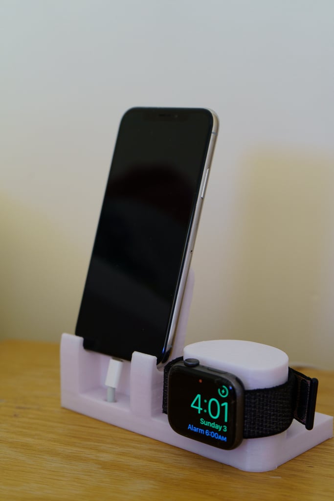 Denne elegante opladningsdock tilbyder en organiseret og praktisk løsning til opladning af både din iPhone og dit Apple Watch. Designet er optimeret med præcist tilpassede huller til både Lightning- og USB-kabler, hvilket sikrer en nem og sikker installation af dine opladningskabler. Med forbedret kabelstyring, der omfatter større kanaler og diskrete holdere på undersiden, undgår du, at kablerne falder ud, og dit opladningsområde forbliver ryddeligt og minimalistisk. Denne Apple Watch charging dock hjælper med at holde dine enheder pænt samlet og klar til brug.