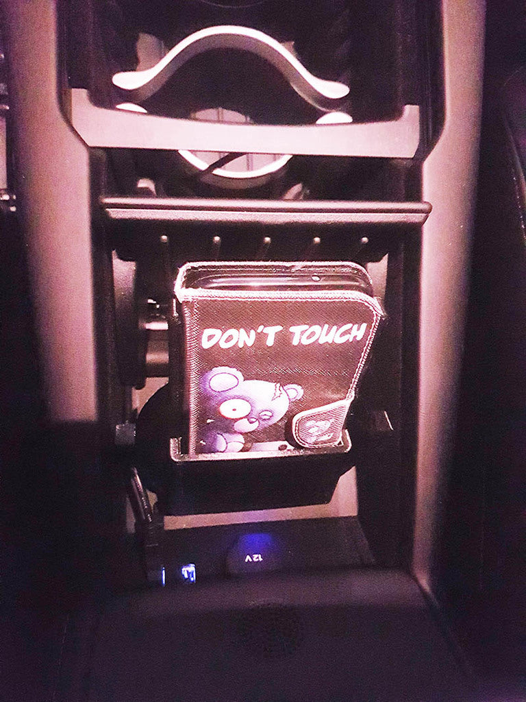 En Tesla Model S Qi trådløs opladerholder til Samsung telefoner. Denne enhed fungerer som en enkel telefonholder, som du kan fastgøre til en Qi-opladningsplade. Den er designet til perfekt at passe ind i Tesla Model S konsollen. Den er specifikt kompatibel med "Samsung Fast Charge" -opladeren, men kan nemt justeres til andre Qi-opladningsplader.