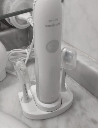Denne praktiske tandbørsteholder er designet til at holde din Philips Sonicare elektrisk tandbørste sikkert på plads. Den giver en organiseret og stabil opbevaringsløsning, der beskytter din tandbørste mod unødvendige skader og sikrer, at den altid er let tilgængelig. Ved at give din elektriske tandbørste en fast plads nær vasken, bidrager denne støtte til en mere strømlinet og effektiv morgen- og aftenrutine. Et ideelt valg for at opretholde orden og funktionalitet i ethvert badeværelse, specielt til brugere af Philips Sonicare.