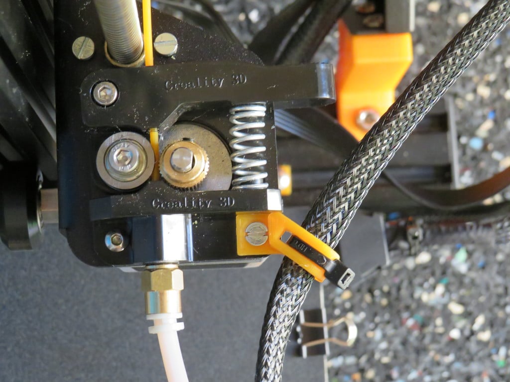 Til installation kræves en skrue, der er lidt længere end den originale, for at sikre en solid fastgørelse. Selvom det ikke er absolut nødvendigt, kan en valgfri kabelbinder anvendes for ekstra sikkerhed og for at holde kablerne pænt på plads, hvilket bidrager til en organiseret opsætning af din 3D-printer. Dette enkle, men effektive tilbehør hjælper med at holde dit arbejdsområde ryddeligt og dine kabler beskyttede.