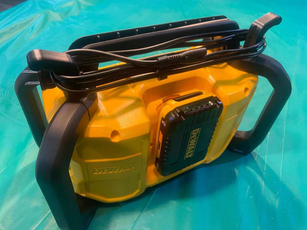 Denne praktiske kabelholder er designet specifikt til DeWalt DCR028 radioen og løser problemet med at opbevare det aftagelige AC-strømkabel, når radioen kører på batteri. Kabelholderen monteres diskret bag radioens bærehåndtag og sikrer, at dit strømkabel er sikkert opbevaret og nemt at finde igen. Med denne løsning undgår du, at kablet bliver væk, og du kan holde dit arbejdsområde mere organiseret og fri for rod. En valgfri omvendt version er også tilgængelig, skulle du foretrække en anden kabelvikling. For yderligere sikring af kablet kan en S-krog eller en lignende wire clip bruges til at holde det fast efter oprulning, hvilket giver en endnu mere stabil opbevaringsløsning.