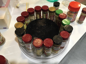 Dette funktionelle krydderistativ er designet til at optimere din krydderiopbevaring og skabe bedre overblik i køkkenet. Stativet placeres centralt i en eksisterende lazy susan-organisator og fungerer som en forhøjning, der hjælper med at organisere dine krydderier. Det sikrer, at krydderiglas i den yderste ring holdes pænt på plads, samtidig med at det forbedrer synligheden af de krydderier, der typisk står skjult i midten. En praktisk løsning til din krydderihylde, der gør det nemmere at finde præcis det krydderi, du har brug for.