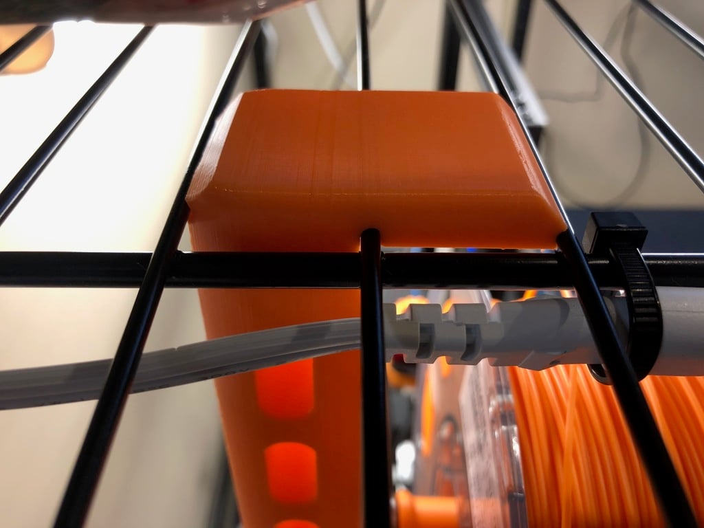 Installationen er ligetil; den klikkes nemt på wirehylden og skubbes i position, hvilket frigør værdifuld plads på dit arbejdsområde. Spolens placering er ofte optimal for populære printere som Ender 3, men kan varieres for at passe til din specifikke printer og hyldeopsætning. Denne løsning tilbyder en organiseret og effektiv måde at opbevare og anvende dit filament på, bidragende til et mere ryddeligt og funktionelt 3D-printermiljø.