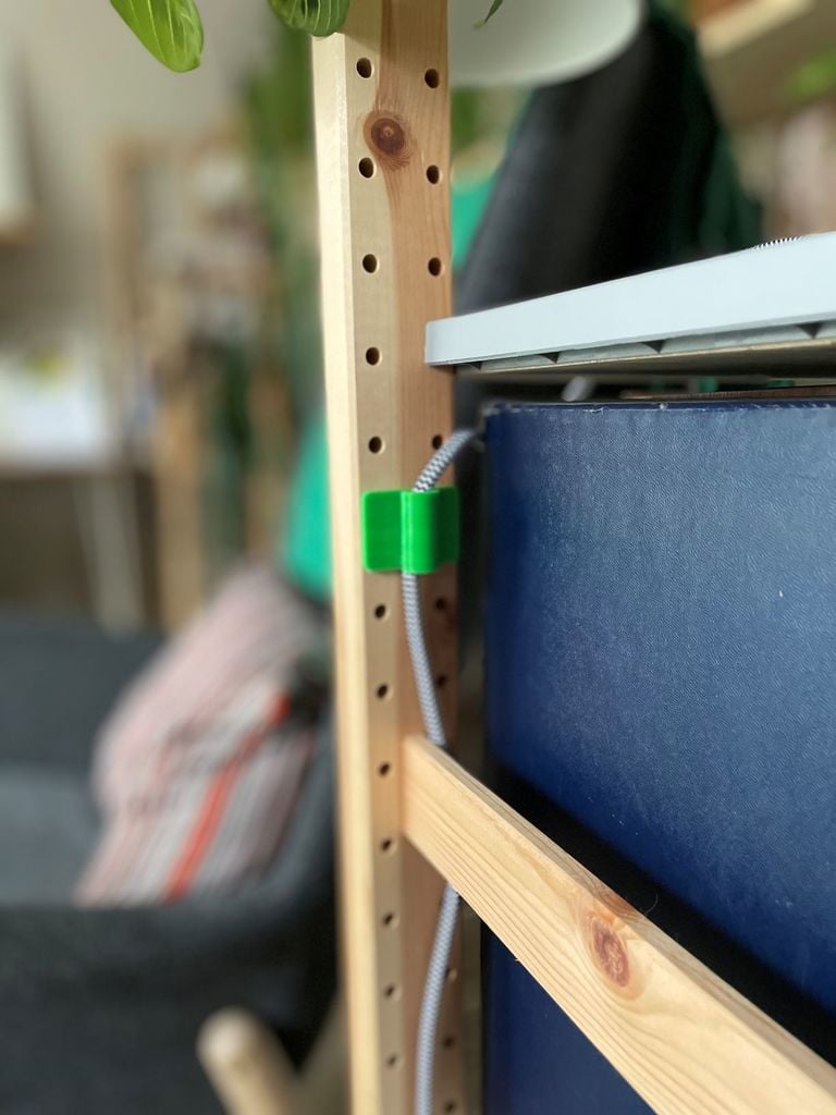 Disse ledningsholdere er udviklet til at forbedre organiseringen af kabler i forbindelse med IKEA IVAR hyldesystemer. Sættet indeholder tre forskellige varianter af kabelklips, som tilbyder fleksible løsninger til ledningsstyring. To af klipsene er designet til at passe ind i hullerne på IVAR-sidestolperne, hvoraf den ene understøtter vandret føring af ledninger, og den anden lodret føring. Den tredje klips monteres på kanten af en IVAR-hylde, hvilket giver en yderligere mulighed for at fastholde ledninger. Ved at anvende disse klips kan man opnå en mere struktureret og ryddelig opbevaringsløsning, idet løse kabler samles og føres diskret langs reolen.
