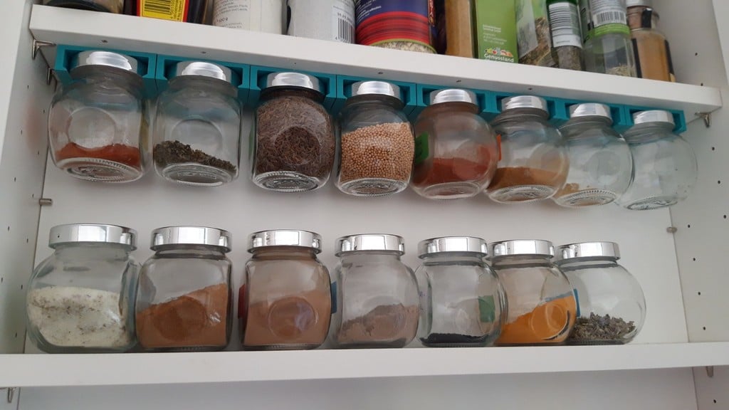Designet gør det muligt at udnytte pladsen i dit køkken effektivt, samtidig med at krydderierne forbliver i god stand. Når du bruger produktet, skal du sikre dig, at der er tilstrækkelig afstand til bagvæggen og døren, da glassene kan være bredere end brakettet.