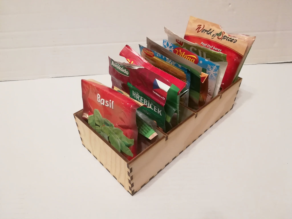 Denne krydderiorganisator er det perfekte værktøj til at holde styr på dine krydderiposer i køkkenet. Fremstillet af 4 mm fyrretræ, tilbyder den både holdbarhed og et elegant udseende. Med sin funktionelle design kan du nemt organisere og finde dine krydderier, hvilket gør madlavning mere effektiv og fornøjelig. Dens kompakte størrelse passer ind i de fleste køkkenskabe og skuffer, så du kan udnytte pladsen optimalt.