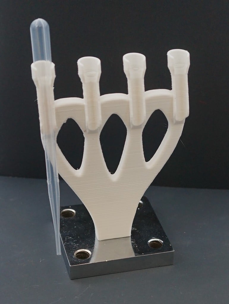 Holderen kan nemt fastgøres til en metalplade med et M3 skrue, som giver dig mulighed for at tilpasse din opsætning alt efter behov. Den integrerede base kan printes i to dele, så du kan fylde den med sand eller andet materiale for at øge stabiliteten, hvilket gør det til en fleksibel og nyttig løsning til laboratoriebrug.