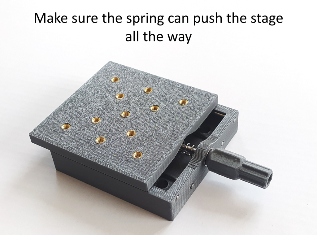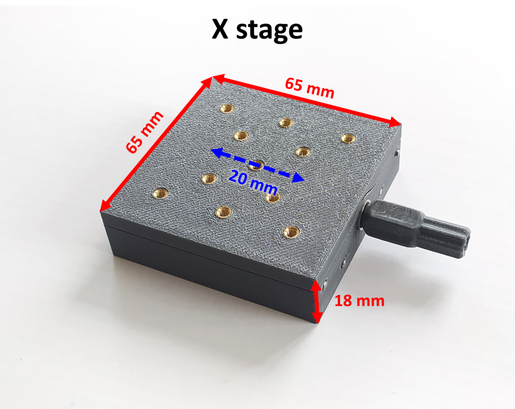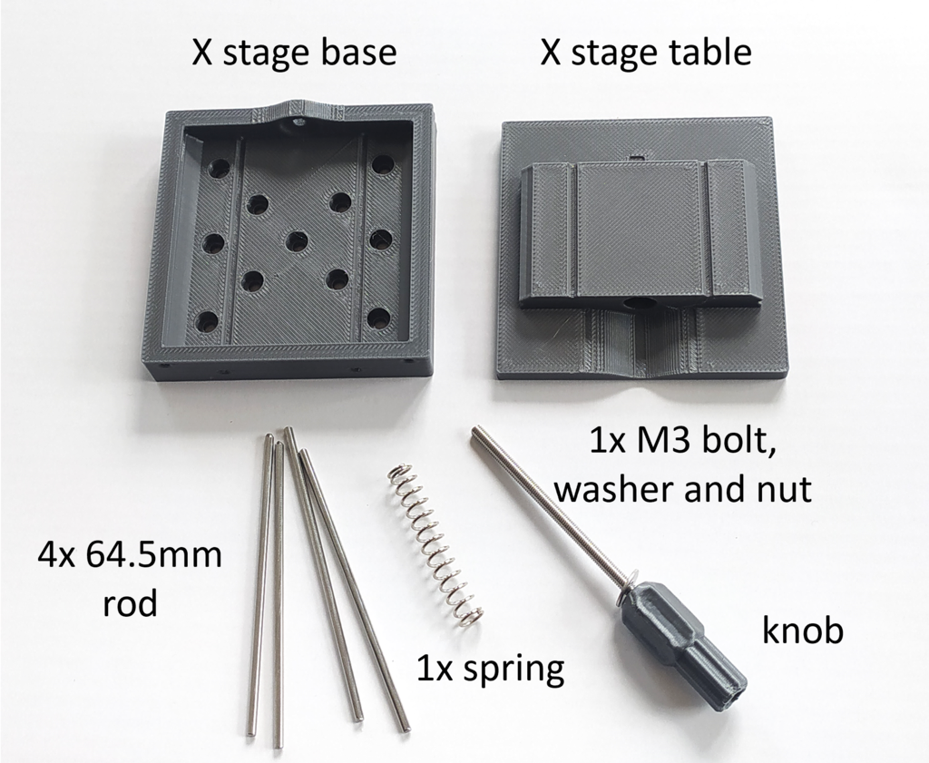 Den printed lineære stage er en praktisk løsning til præcisionspositionering med en nøjagtighed på op til 10 mikron. Designet er ideelt til projekter, hvor præcise bevægelser er afgørende. Den anvender 3D-printede dele sammen med 2-mm metalstænger, en 40-mm fjeder og en 55-mm M3 bolt med møtrik og undermøtrik for at sikre stabilitet og funktionalitet.