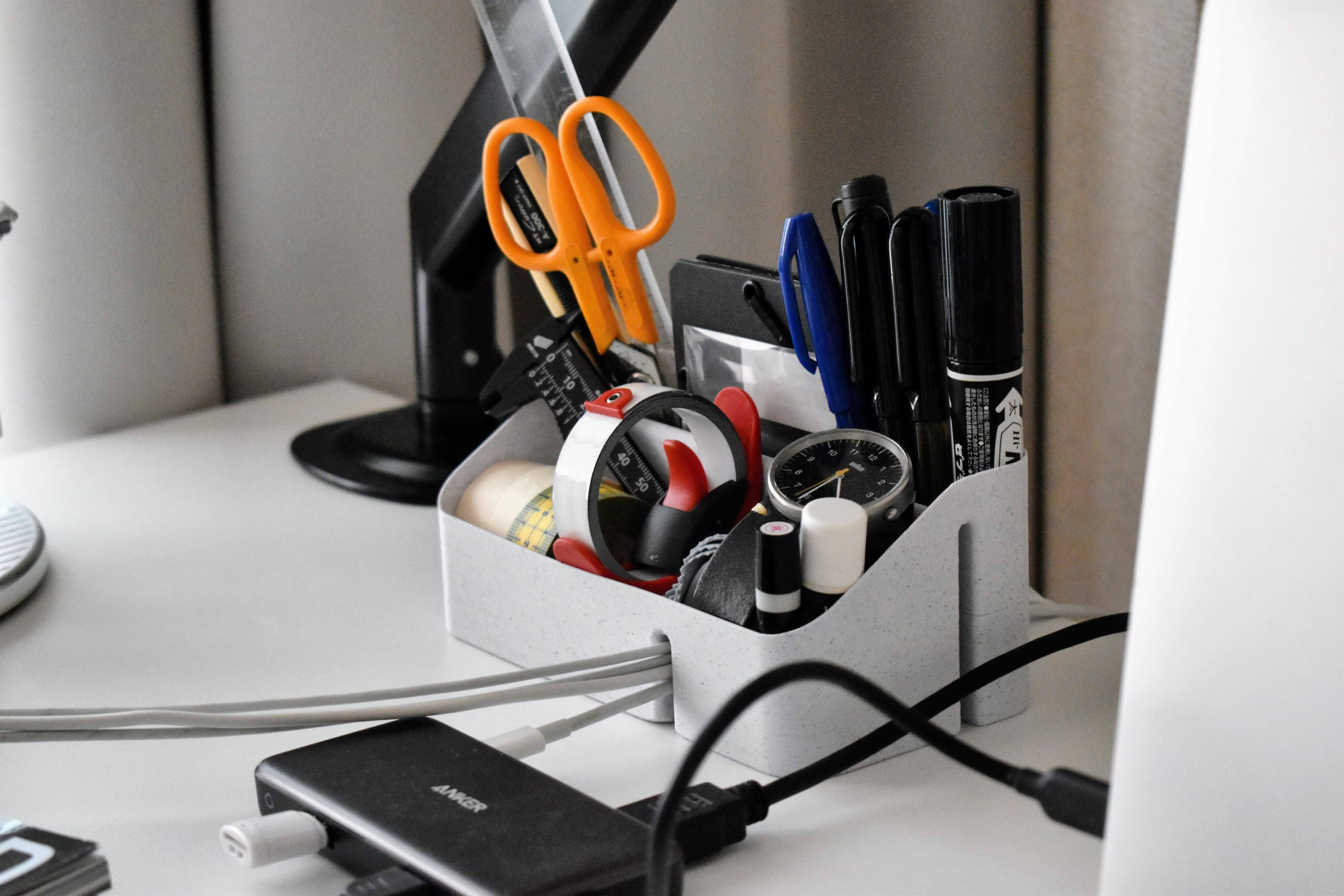 Denne praktiske skrivebordsorganisator er designet til at hjælpe dig med at holde orden på dit arbejdsområde. Den kombinerer effektiv opbevaring til dine kontorartikler med en smart løsning til kabelstyring. Med flere dedikerede rum kan du nemt organisere penne, blyanter, notesbøger og andre småting, så de altid er lige ved hånden.
