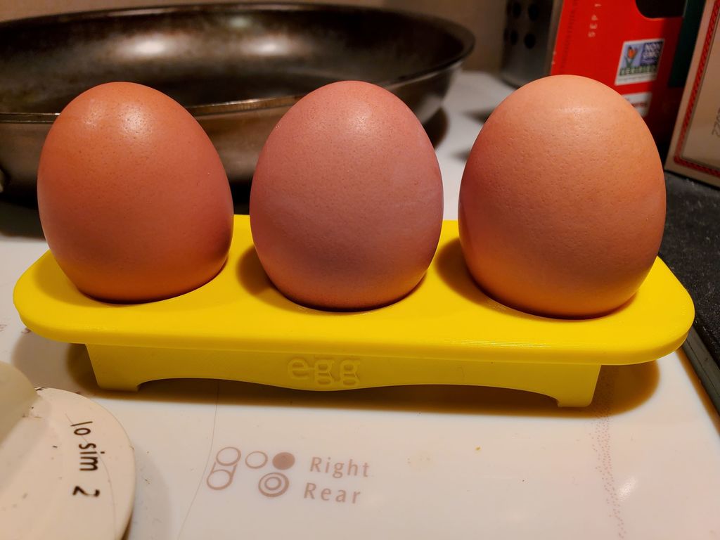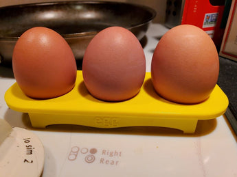 Den praktiske æggeholder er designet til at opbevare op til tre æg sikkert på dit køkkenbord. Den hjælper med at holde æggene stabilt på plads, så de ikke ruller rundt eller falder af, mens du forbereder dine måltider. Dette gør det lettere at tilgå æggene, når du har brug for dem, for eksempel når de skal opnå stuetemperatur. Holderen tilbyder en organiseret og stabil opbevaringsløsning, der passer diskret ind i de fleste køkkenmiljøer.