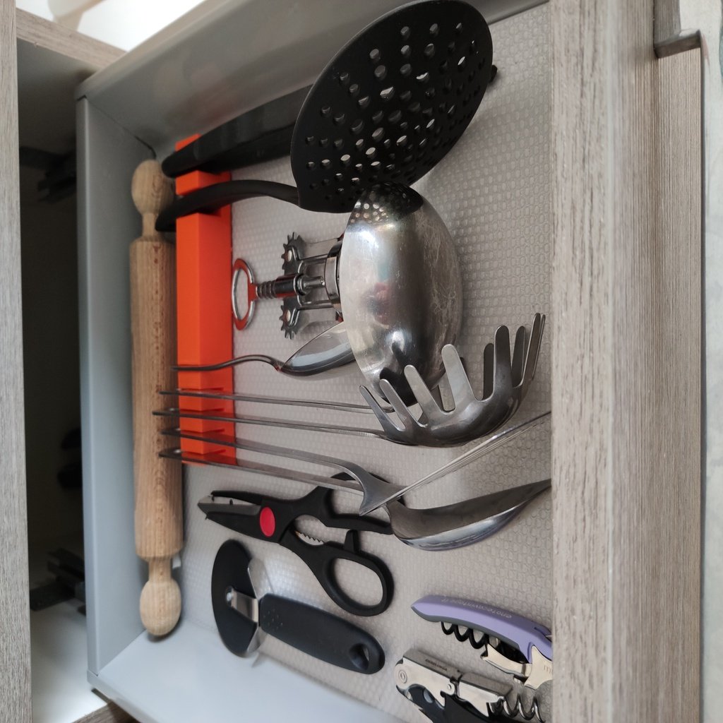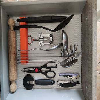 Denne skuffeindsats er designet til at skabe orden og optimere opbevaringen i dine køkkenskuffer. Med dens syv separate rum kan du nemt sortere og opbevare et bredt udvalg af køkkenredskaber, såsom bestik og små gadgets. Dette giver et klart overblik og sikrer, at du hurtigt finder det, du leder efter, uden at skulle rode. For dem der foretager en grundig 'competitor search' efter effektive organiseringsløsninger til køkkenet, tilbyder denne indsats en praktisk måde at forbedre funktionaliteten på. Selvom den er ideel til redskaber, bidrager den til den generelle orden i skuffen, ligesom en 'spice organizer' holder styr på krydderierne, og dermed understøtter den et mere ryddeligt og effektivt køkkenmiljø.