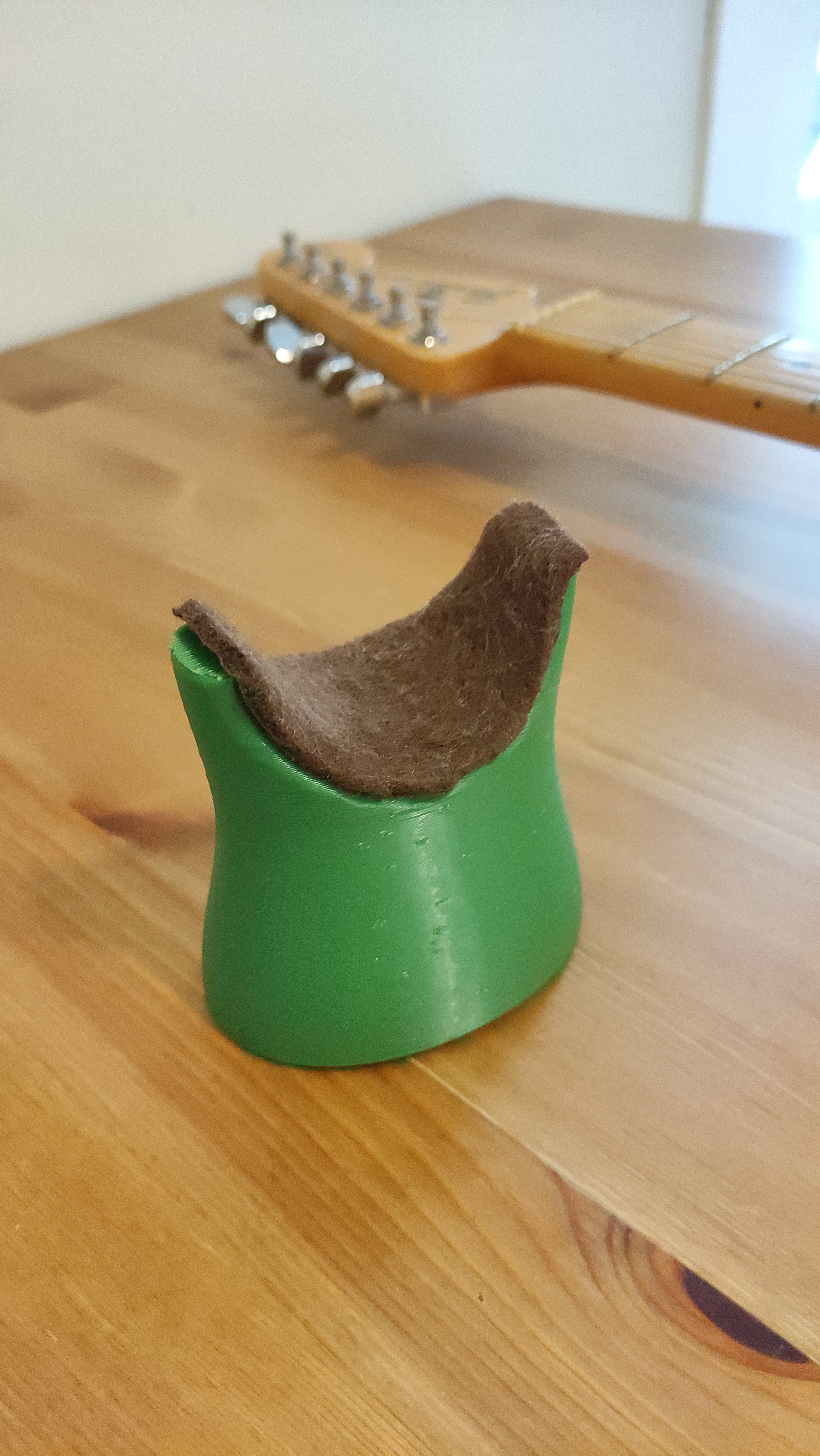 Halsstøtten er dog alsidig og kan også anvendes højere oppe på guitarens hals, alt efter opgaven. For at beskytte guitarens lak og træværk anbefales det stærkt at polstre kontaktfladen med et blødt materiale som selvklæbende filt. Den let buede bund er gennemtænkt for at give en god balance og følge guitarens naturlige vinkel under arbejdet, hvilket bidrager til øget stabilitet.
