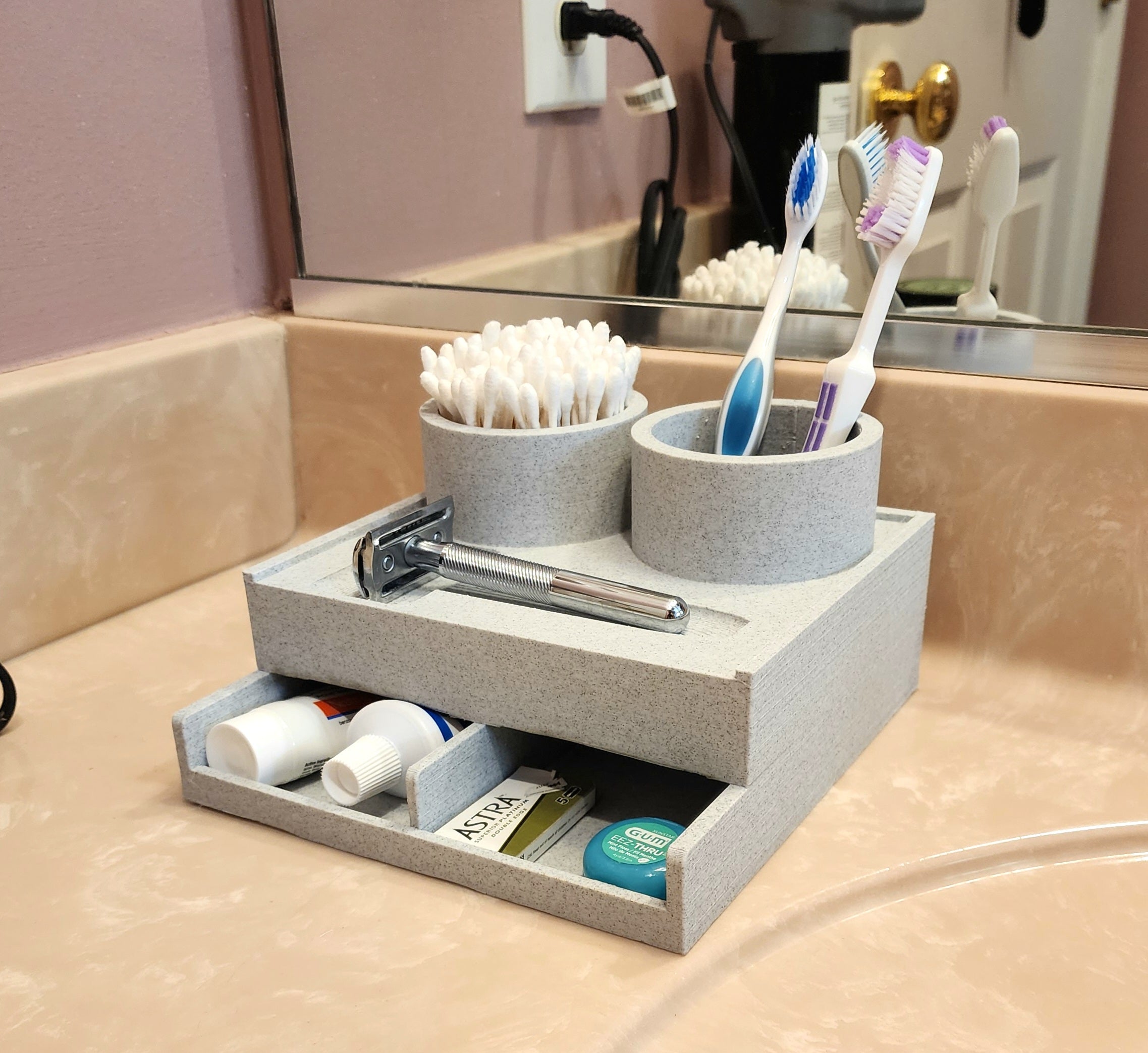 Forvandl dit badeværelse til et organiseret og ryddeligt rum med denne smarte Catch-All Vaskearrangør. Designet til at maksimere pladsen omkring din vask, tilbyder denne arrangør en integreret løsning for alle dine daglige fornødenheder. Du finder dedikerede rum til dine tandbørster, en barbermaskine og vatpinde, samt en praktisk skuffe, der er perfekt til opbevaring af medicin, tandpasta eller ekstra barberblade.