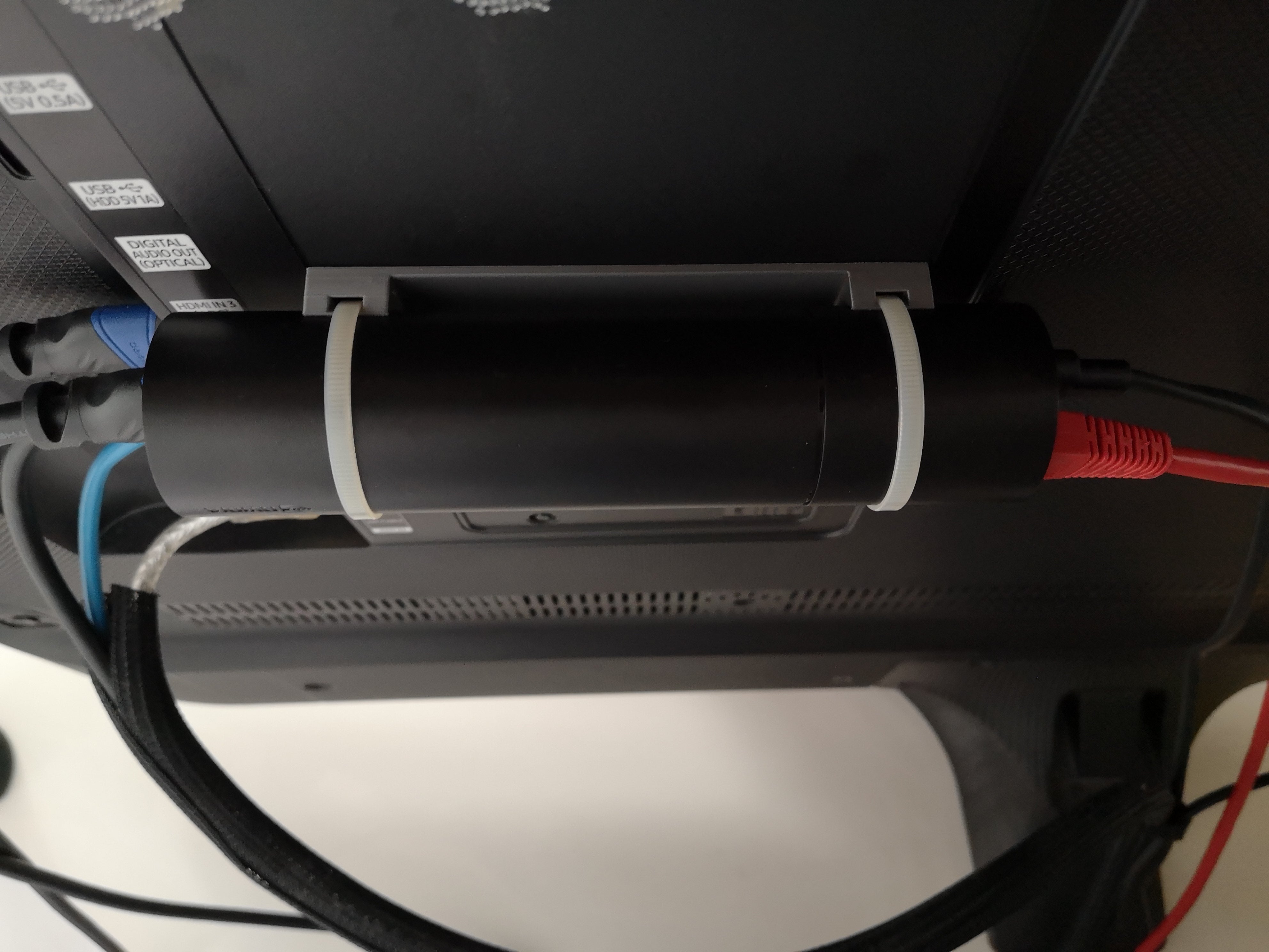 For optimal holdbarhed og for at modstå varme fra enheden og TV'et anbefales det at bruge et varmebestandigt materiale som PETG, hvilket sikrer langvarig funktionalitet og stabilitet af dit mount.