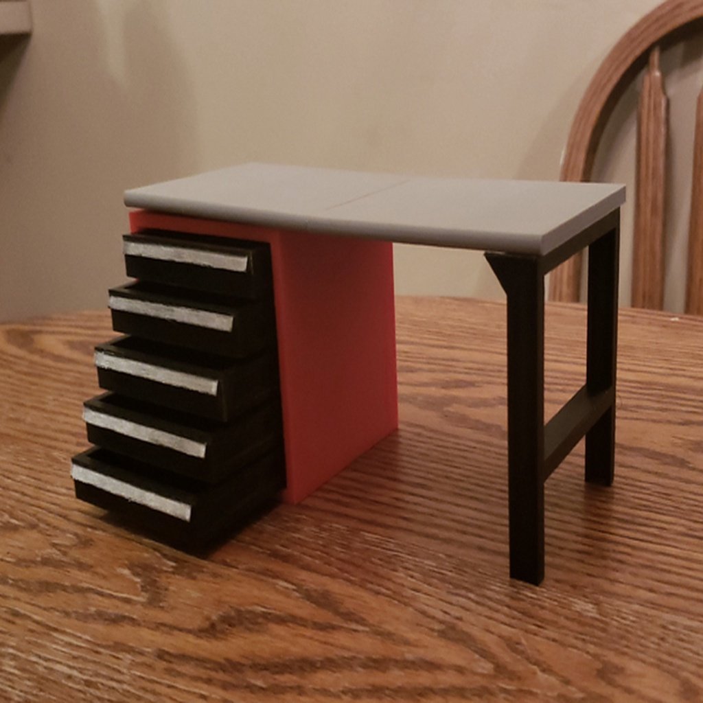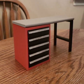 Dette skala værkstedsbord med værktøjsskab er en detaljeret tilføjelse til enhver miniature garage eller værksted. Designet i skala 1:10, passer det perfekt ind i miljøer med RC-køretøjer og andre modelopbygninger, og skaber en autentisk ramme for dine hobbyprojekter. Værktøjsskabet er fuldt funktionelt med skuffer, der giver dig mulighed for at organisere dine små dele og miniatureværktøjer effektivt. Dette giver en ubesværet arbejdsgang og gør det nemt at organisere, så din modelopsætning kan tåle en "competitor search" i forhold til funktionalitet og detaljegrad.