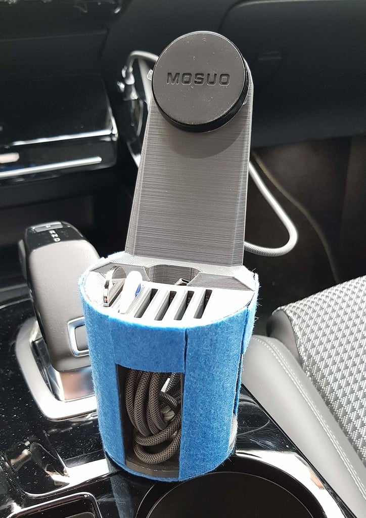 Udover telefonopbevaring inkluderer designet seks møntfag, der kan anvendes til praktisk opbevaring af småmønter, f.eks. til parkering eller vejafgifter. Produktet er designet til at passe præcist i bilens eksisterende kopholder, og et filtlagen kan eventuelt tilføjes for en endnu mere optimal pasform.