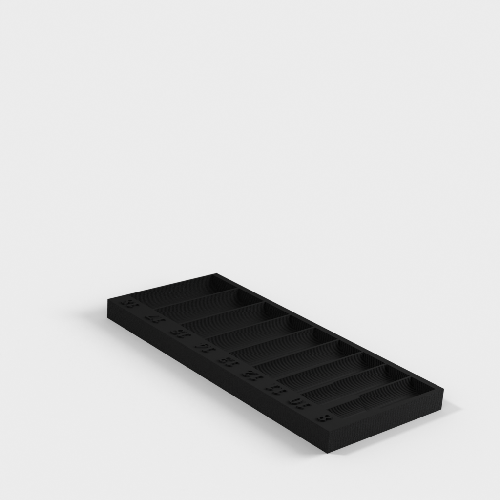 Denne praktiske stik organizer er udviklet til at systematisere dine dybe toppe og sokler. Med plads til otte 3/8" dybe toppe hjælper den med at holde dit værktøj pænt samlet og forhindrer dem i at ligge løst i skuffer eller på arbejdsflader.