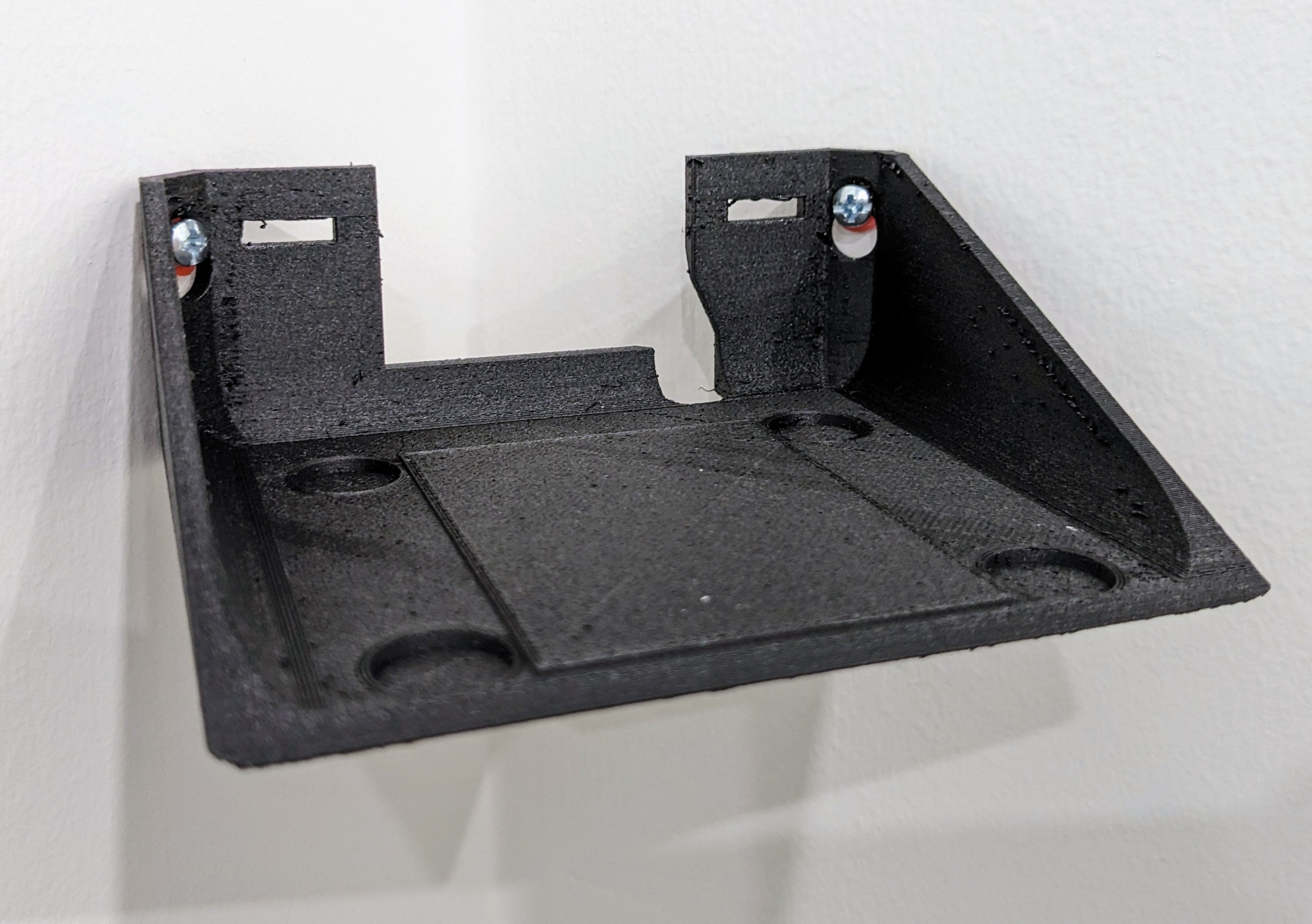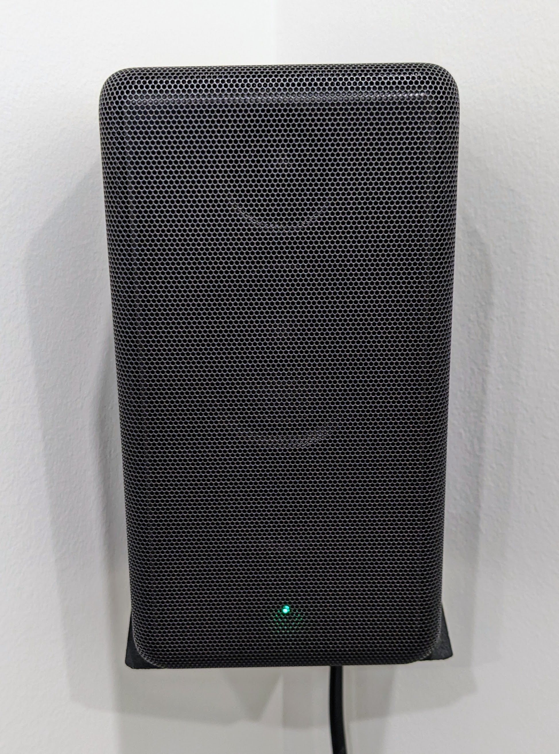 Beslaget monteres sikkert på væggen med to skruer, og det anbefales at anvende vægankre for yderligere stabilitet. Højttaleren sidder tæt og sikkert i beslaget takket være specifikke udskæringer til højttalerens fødder og en låsemekanisme, der forhindrer den i at tippe fremad, selv ved et uheldigt puf.