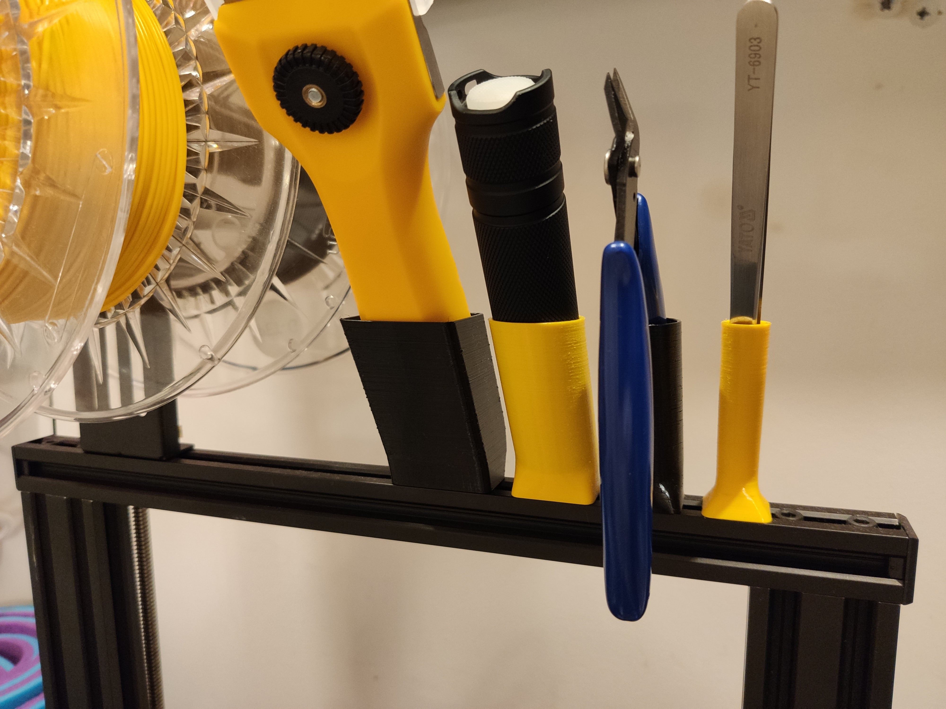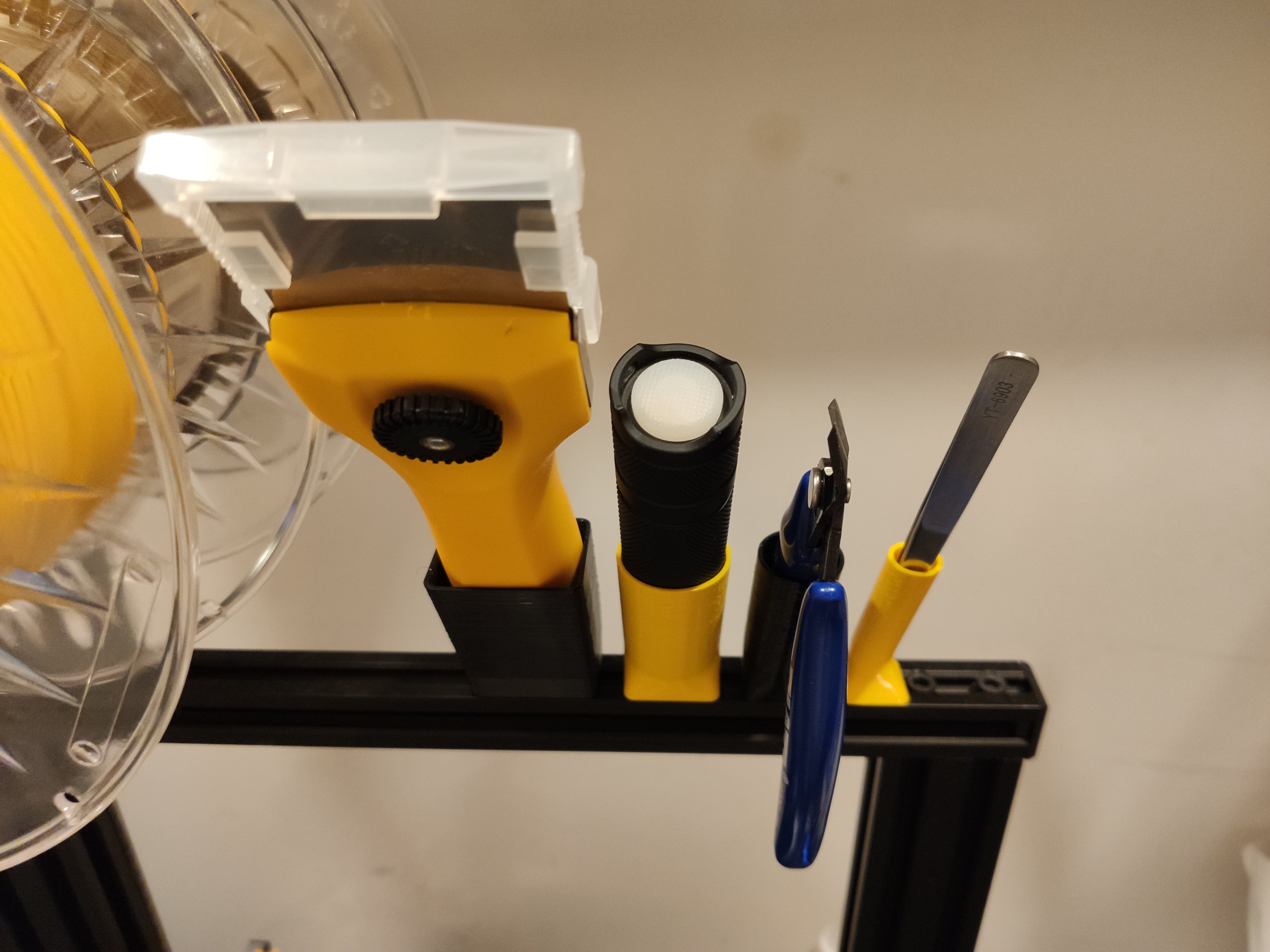 Hver holder fastgøres individuelt til ekstruderingen med en enkelt T-nut og en M4 skrue, hvilket giver en stabil og pålidelig montering. Dette system hjælper med at opretholde et ryddeligt og funktionelt arbejdsstation, hvor vigtige værktøjer er systematisk organiseret og lette at finde, hvilket forbedrer din arbejdsproces.
