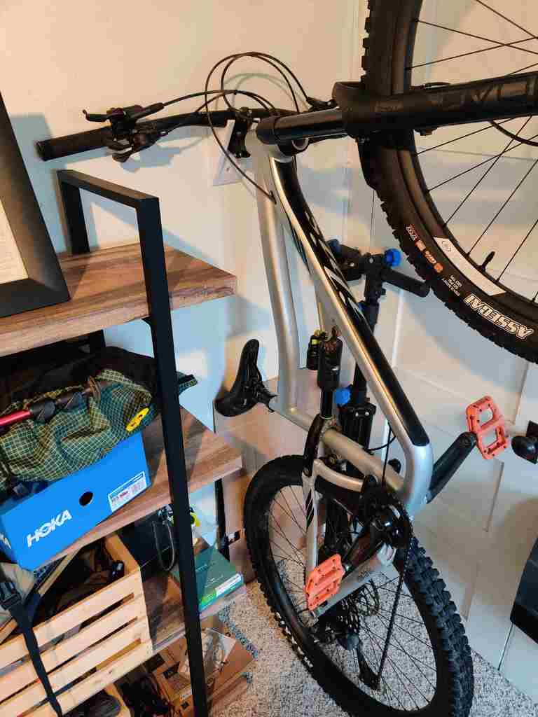 Vægbeslag til en 2020 Ibis Ripmo AF mountainbike. Dette beslag er designet, så cyklen hviler tæt op ad væggen, mens baghjulet hviler på jorden. Det er et robust stykke udstyr, der nemt kan klare vægten af din cykel. Kan monteres ved hjælp af sidebeslagene. Kompatibel med Ripmo AF-modellerne.