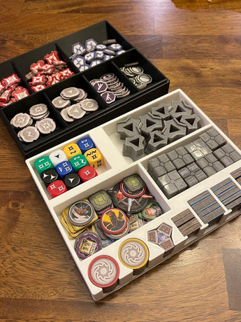 Hold styr på dine Imperial Assault spilkomponenter med denne effektive organizer til kort og tokens. Systemet omfatter separate bakker designet til opbevaring af sundhed, udholdenhed, tilstand og kraft tokens, samt andre tokens og terninger. De medfølgende bakker er ideelle til opbevaring af 3D-printede terminaler og forsyningscuber, hvilket sikrer, at alle tokens fra kerne- og expansionssættene nemt kan opbevares.