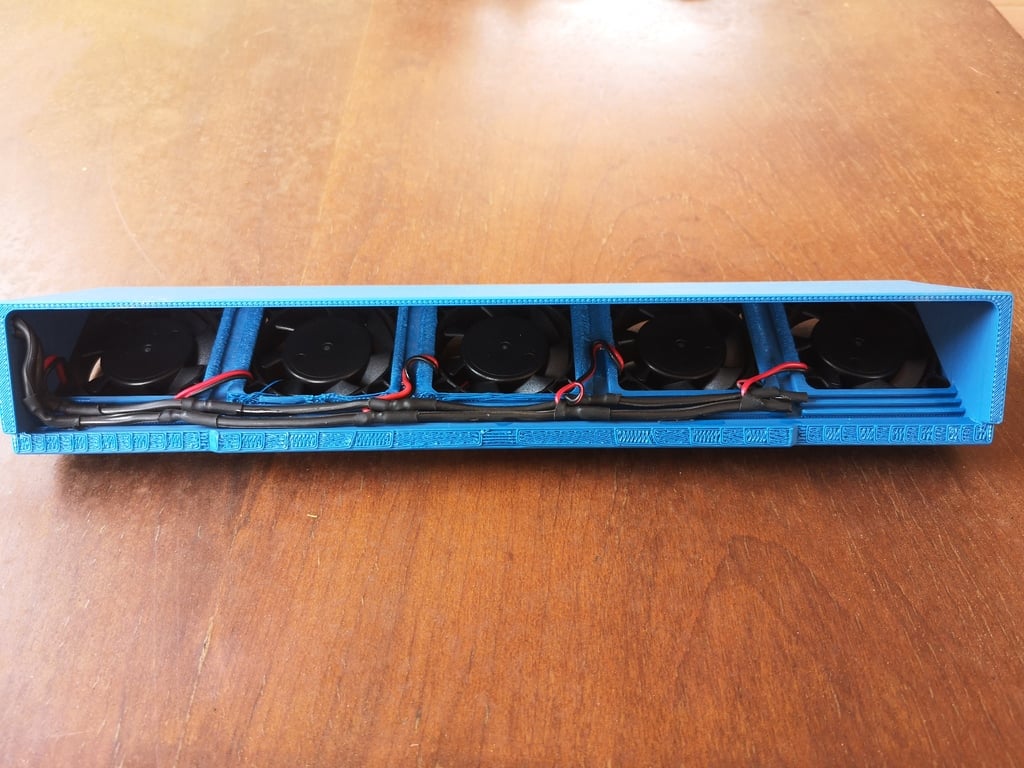 En extractor cowl designet til at passe 5x 40mm fans på en Victron 250/100 MPPT. Denne cowl forbedrer markant køling på kølepladen bag opladeren.