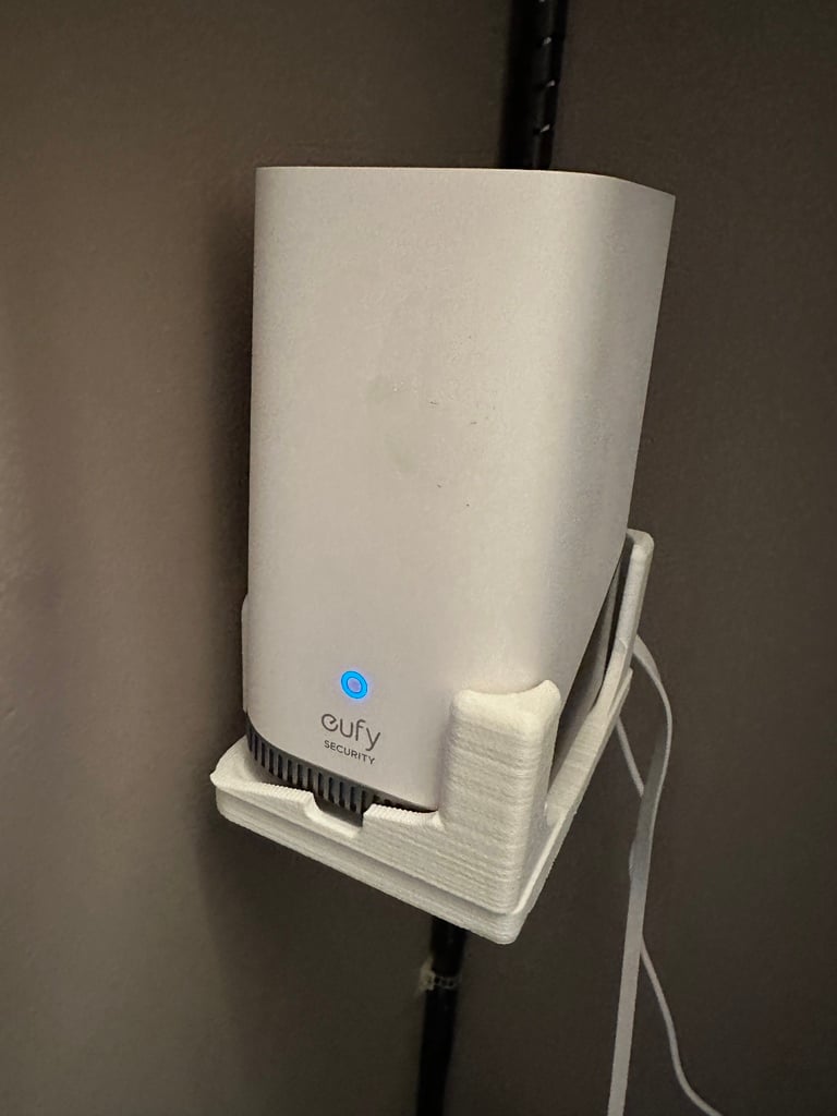 Vægmontering til Eufy's sikkerhedssystem HomeBase 3. Monteringstilbehøret er designet med ventilation og vægstyrke i tankerne. Den har ventilationsåbninger nedenunder og åbninger i hjørnerne for luftstrøm. Væggene er tykkere for ekstra stivhed. Perfekt til placering tæt på dit netværksswitch da det er fastkoblet til ethernet. Bemærk, produktet er vist i eksemplerne er 3D printet.