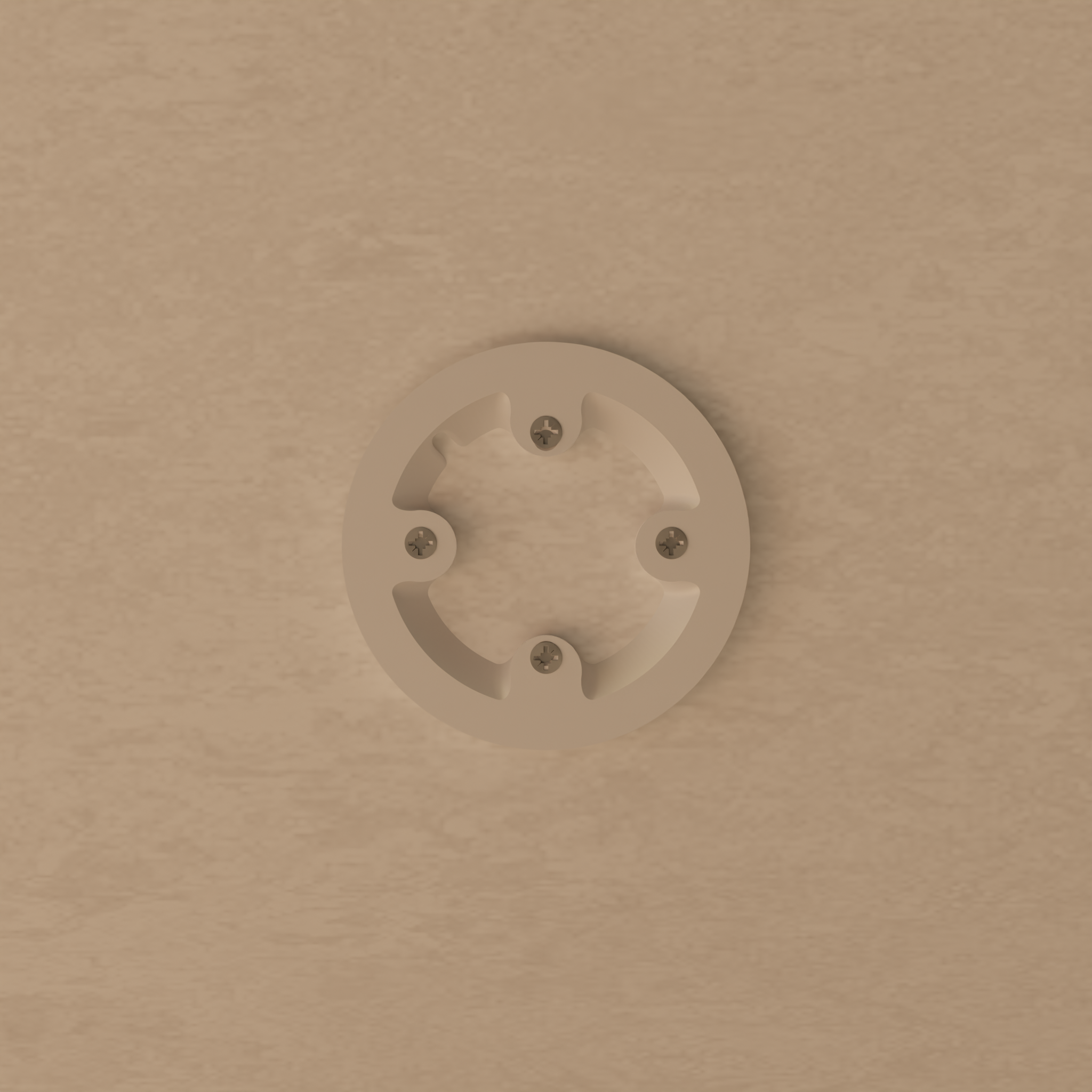 Nest Protect v2 Monteringsring er et robust og skjult monteringstilbehør designet til Nest Protect v2. Denne holder passer kun til den ikke-batteridrevne version af Nest Protect v2, som typisk er placeret i strømboksen i loftet. Du kan bruge fire skruer til at montere den, men selvom to skruer burde være tilstrækkeligt, er det ideelt at bruge alle fire for at sikre en stabil installation.