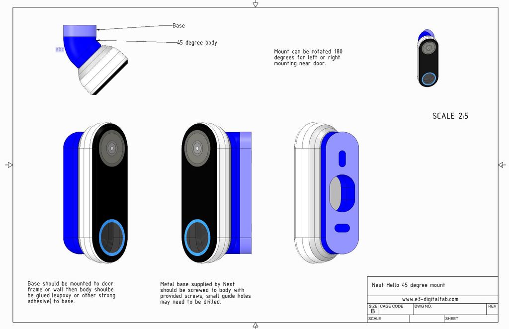Dette monterigsbeslag er designet specielt til Google Nest Hello dørklokken og sikrer, at din klokke er i en perfekt 45 graders vinkel. Sættet består af to dele: en flad base, der let kan monteres på en væg eller dørkarm med skruer, og en 45 graders adapter, der retningslinjer med basen og holder klokken i den optimale position.